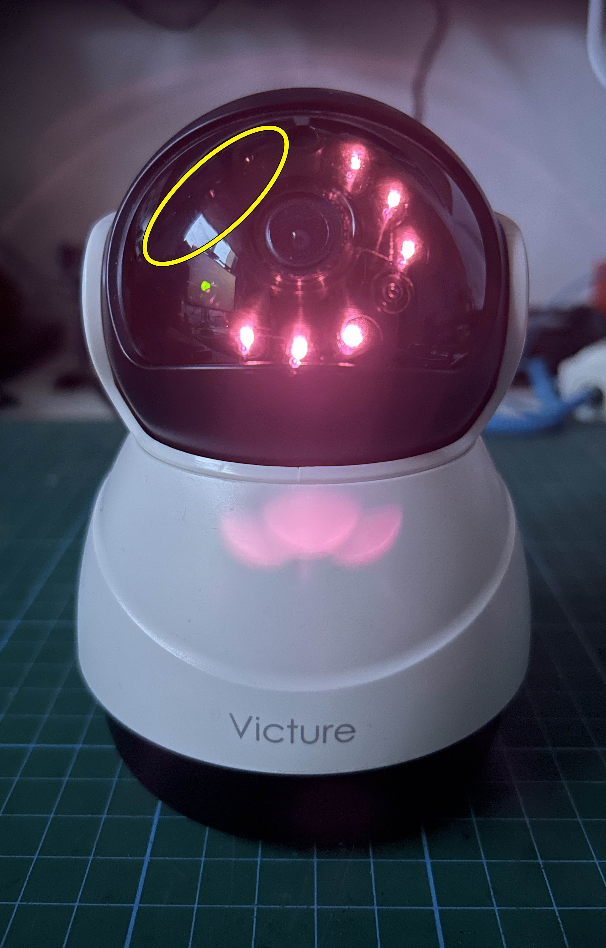 Cámara de vigilancia que muestra un funcionamiento erróneo en los leds infrarrojos, ya que de los nueve que lleva solamente se encienden seis. Estos leds son alimentados por una línea que está condicionada por la luz que capta un fotodiodo. Por tanto solo se activan con oscuridad.