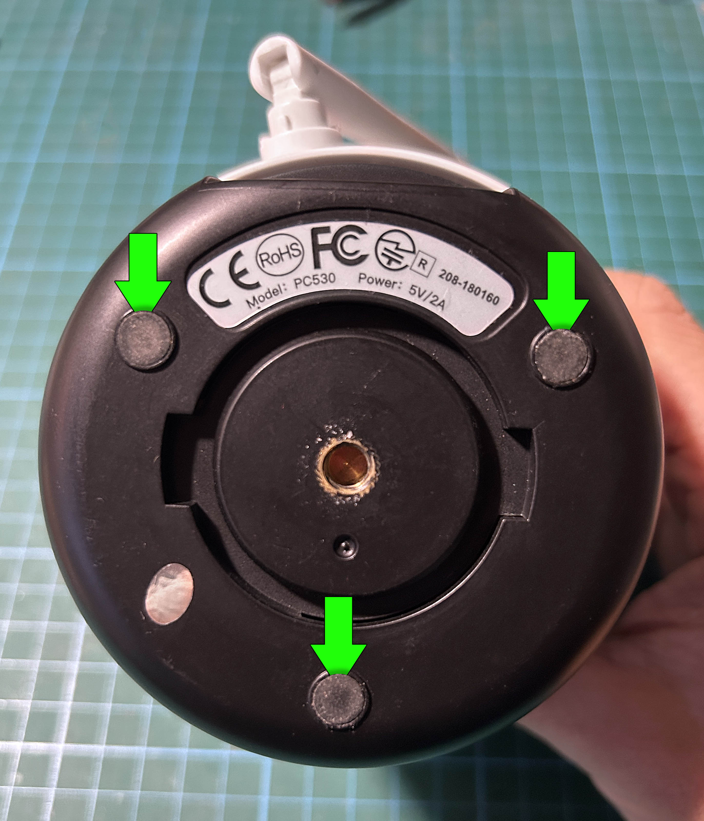 Voy a abrir para ver qué sucede. Para ello tengo que levantar las 3 tapas antideslizantes que se muestran a continuación y tras las cuales están los tornillos para desmontar la base.