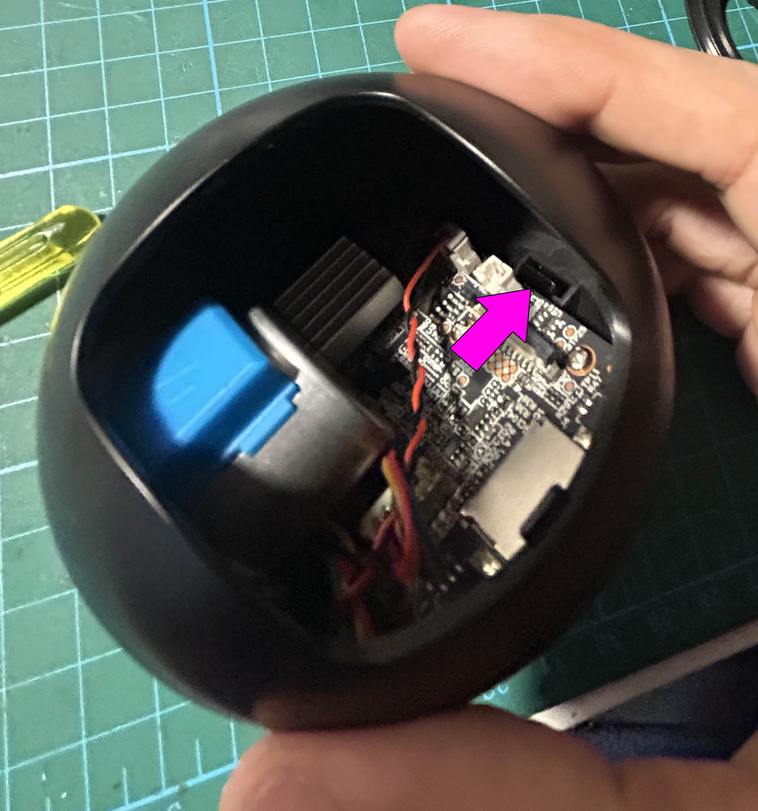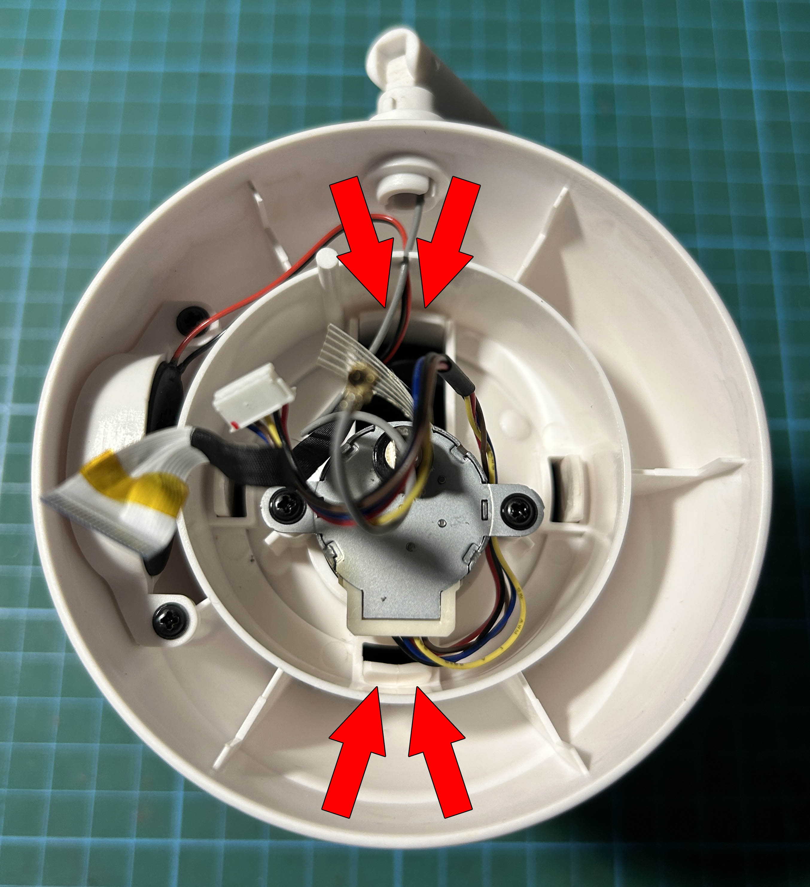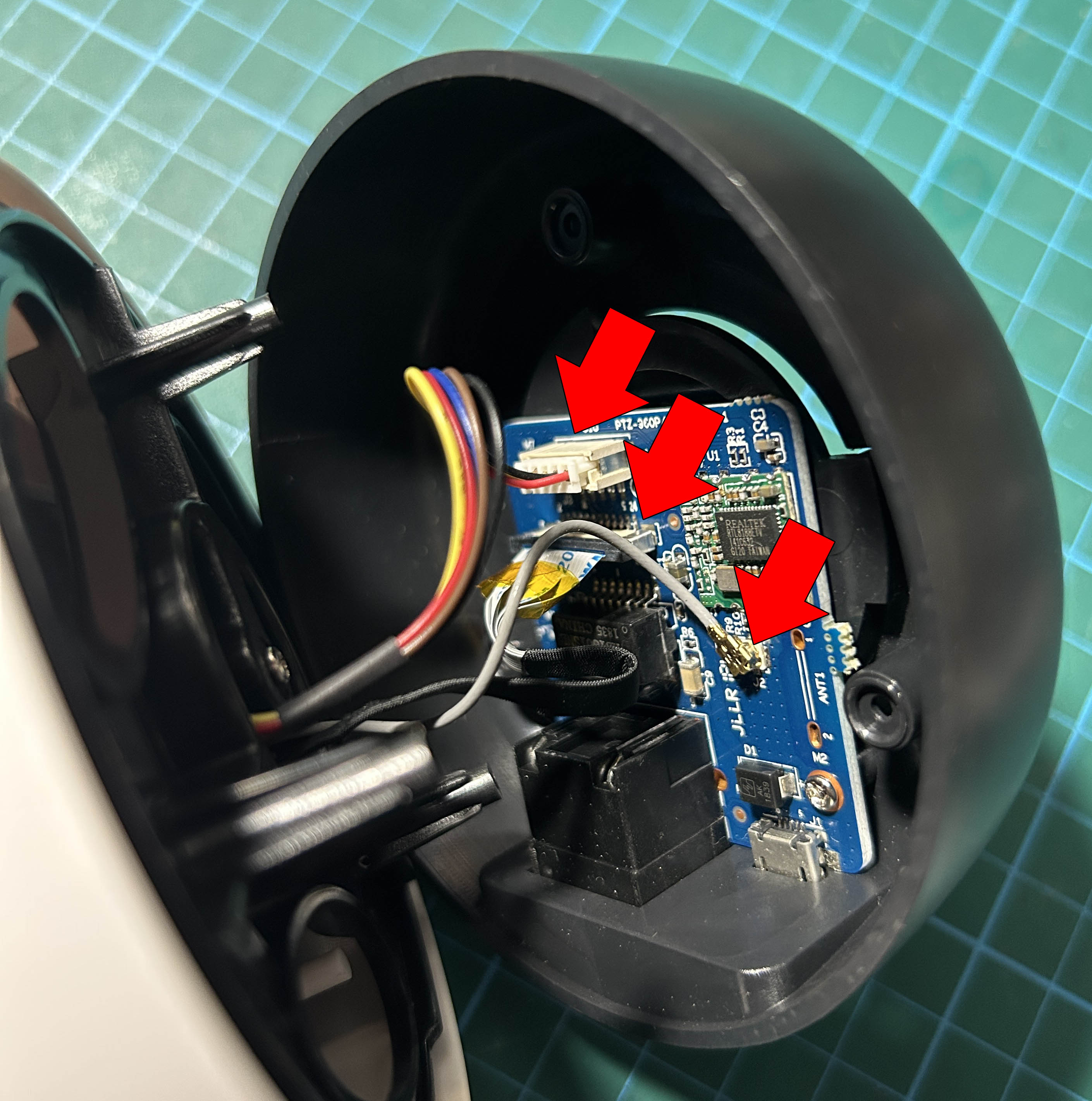 Una vez separada la base desconecto los 3 cables indicados con flechas rojas en la foto inferior. Son el cable del motor Pan, el de la placa base y el de la antena Wifi. En la base quedará la placa de alimentación y conexionado Ethernet.