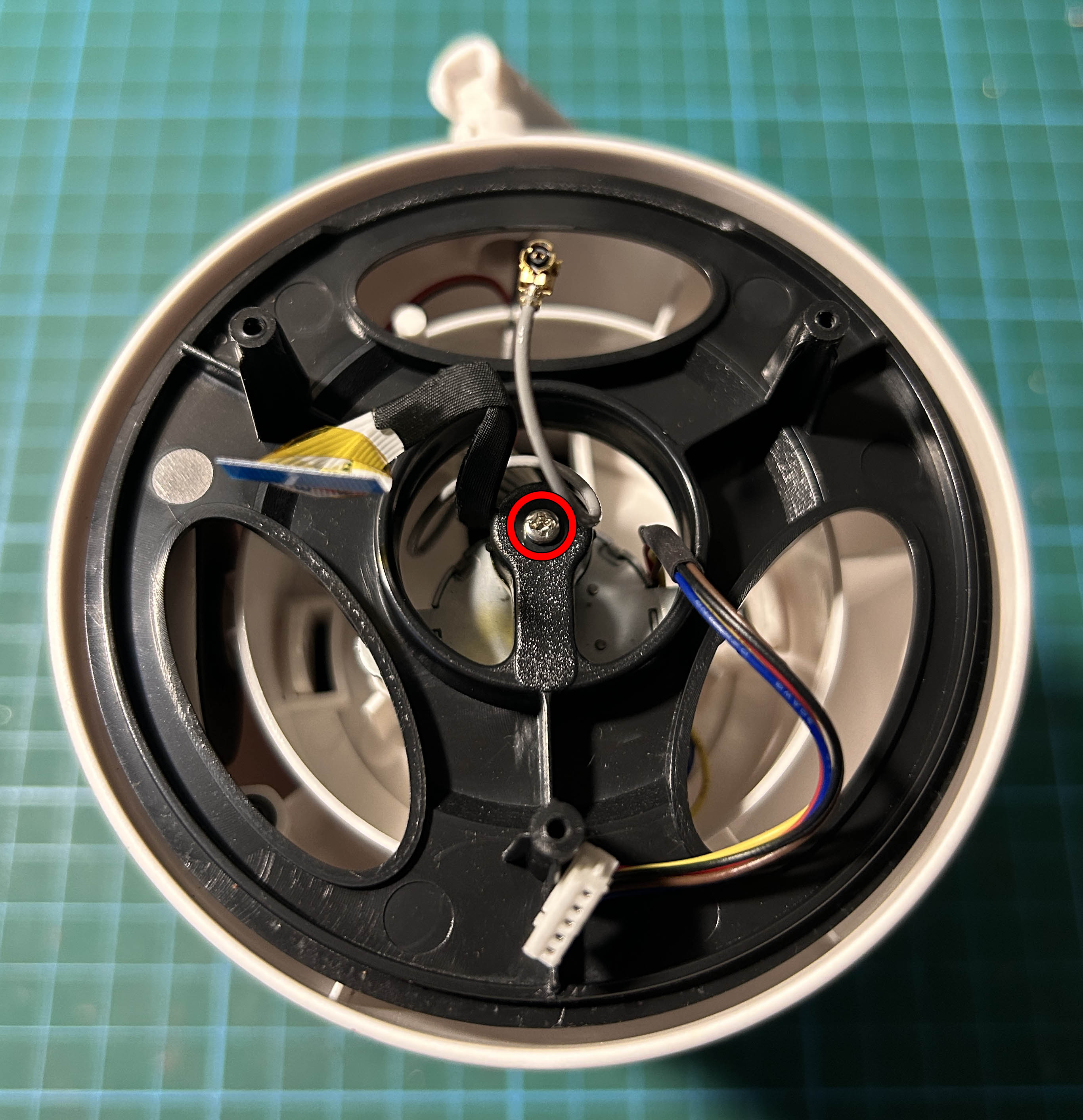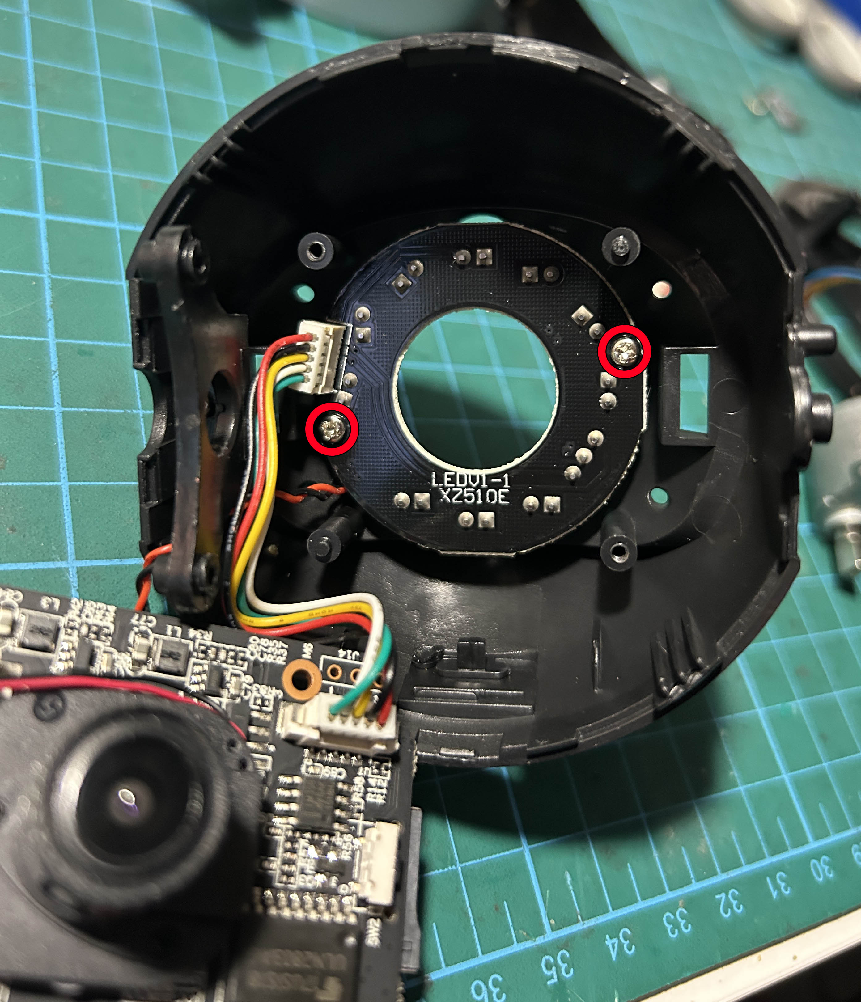 La corona de diodos está bajo la placa base. Toca por tanto desmontar dicha placa. Saco los 2 tornillos marcados en rojo en la siguiente imagen. Es importante no quitar los marcados con una cruz amarilla, ya que son los que sujetan la óptica al sensor de imagen.