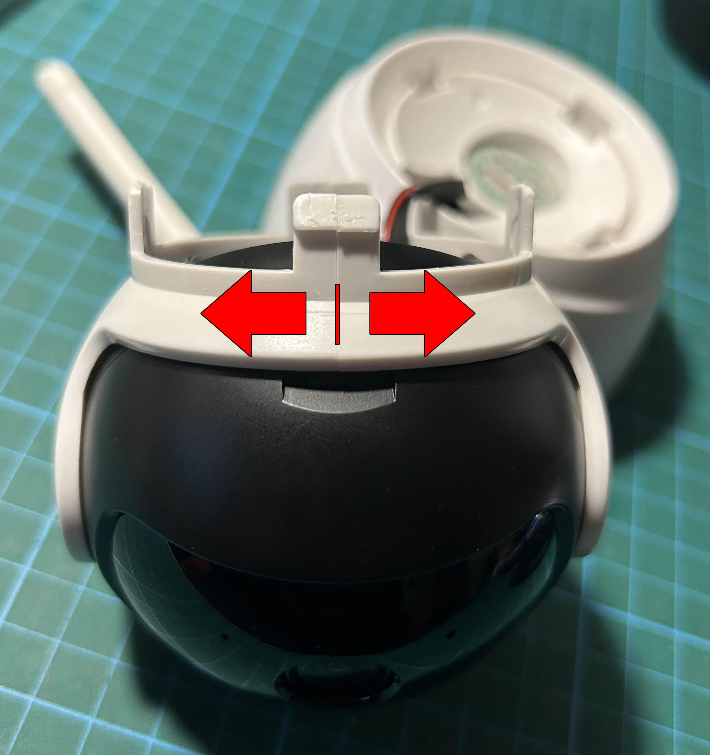 Una vez separada la cabeza de la cámara desencajo los dos plásticos blancos. Saldrán tirando de ellos en direcciones opuestas. Van enganchados entre sí con unas finas pestañas no visibles desde fuera.