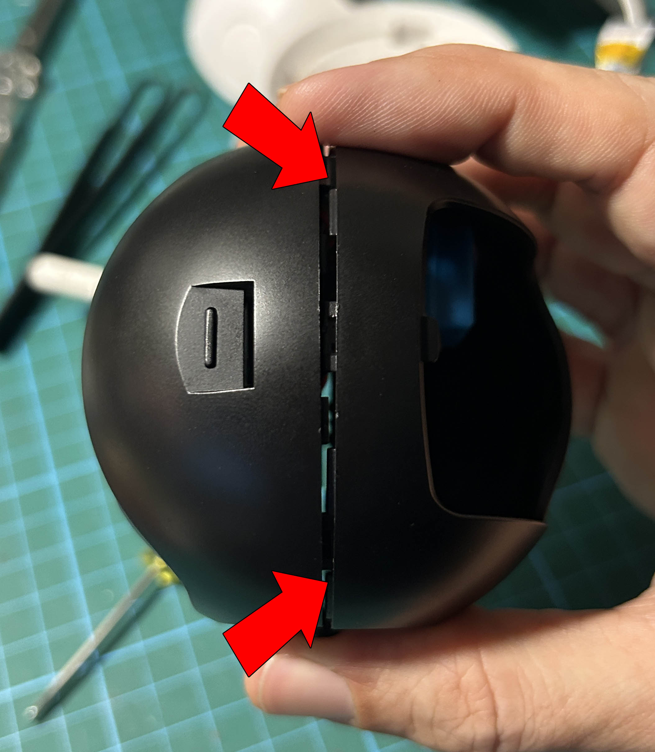 A continuación separo los plásticos de la esfera haciendo palanca a lo largo de la junta. Lo ideal es comenzar por los ejes de la esfera, ya que si se daña un poco el plástico quedará oculto por las protecciones blancas al montar.