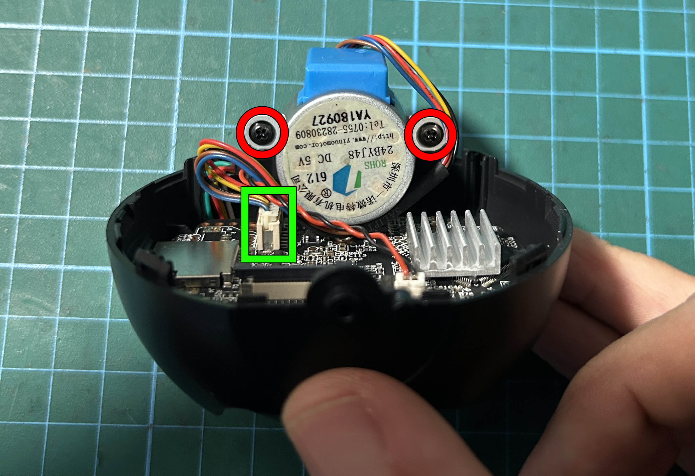 La foto siguiente muestra cómo desmontar el motor Tilt: se desconecta y después se quitan los 2 tornillos marcados en rojo.