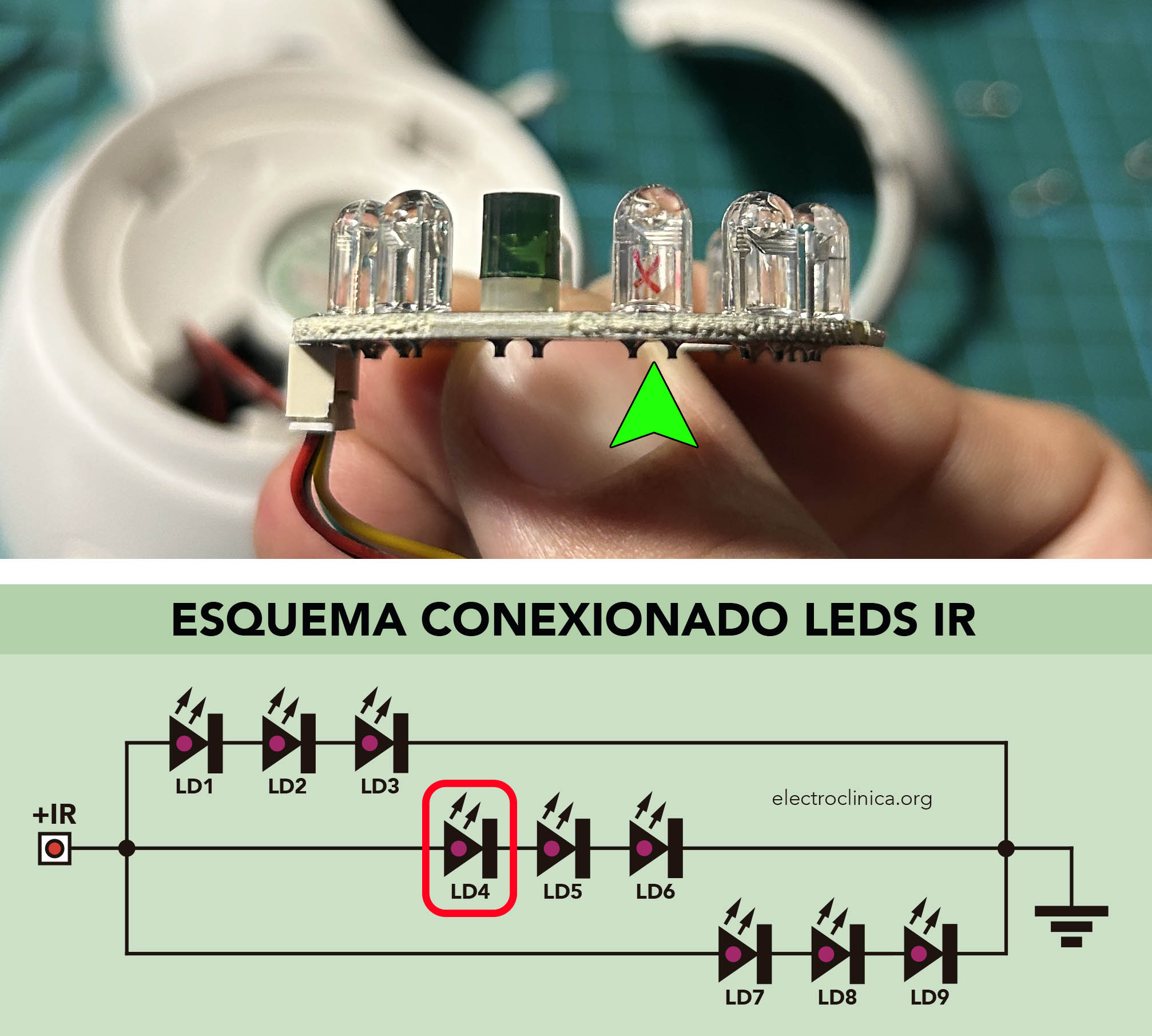 Los leds infrarrojos están conectados en serie de tres en tres, formando tres grupos conectados entre sí en paralelo. Por tanto una misma línea los alimenta a todos. Al ir en grupos en serie, si uno de los leds falla los otros dos leds fallarán también. Lo que haré es comprobar uno a uno cada led. Todos me dan una lectura correcta excepto uno, del cual sospecho de inmediato.