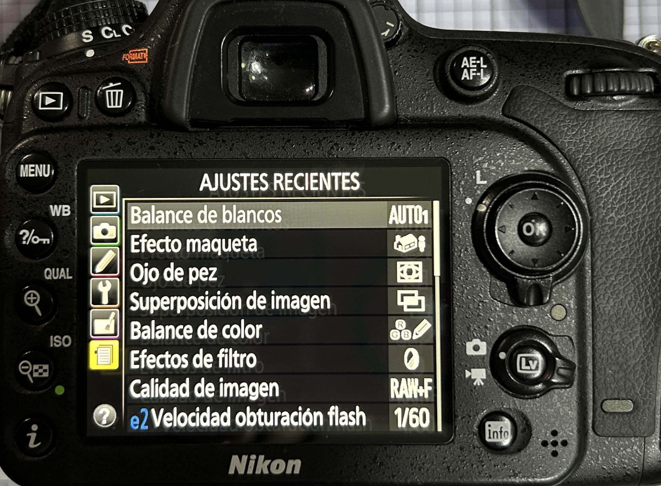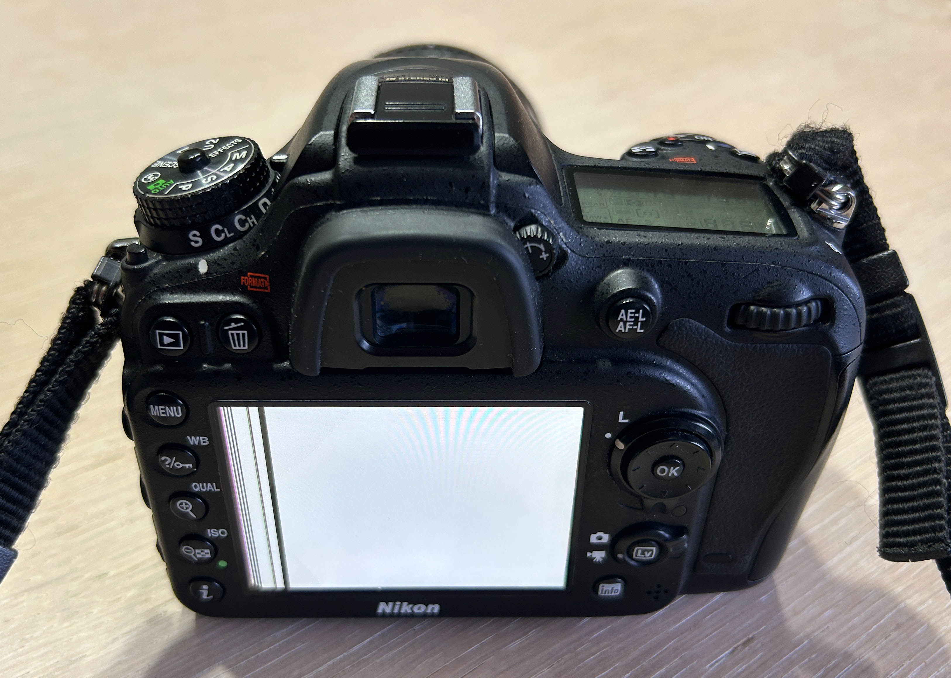 Cámara digital DSLR que presenta un fallo en la pantalla: solo muestra imagen blanca con unas líneas verticales negras en la zona izquierda.