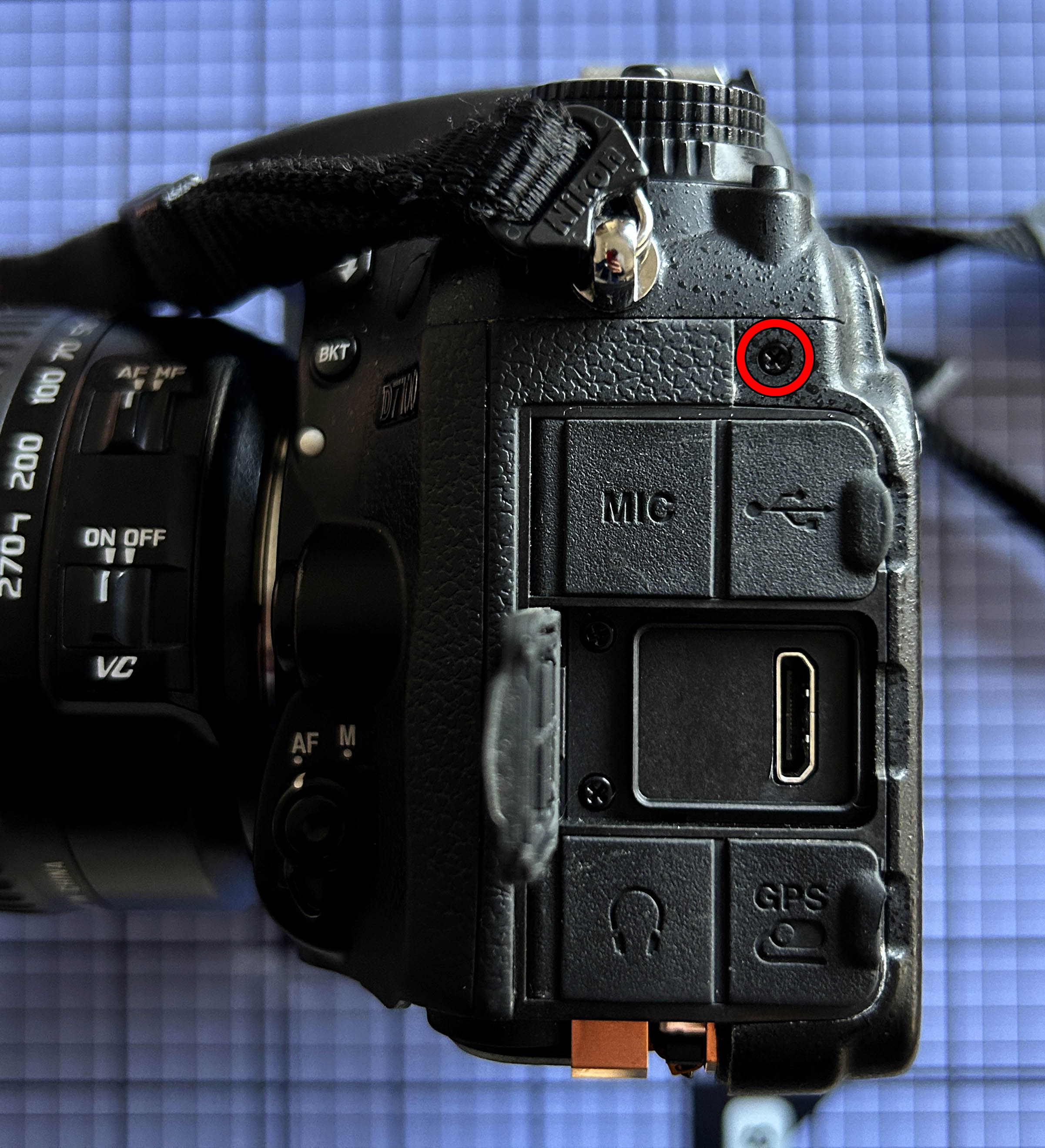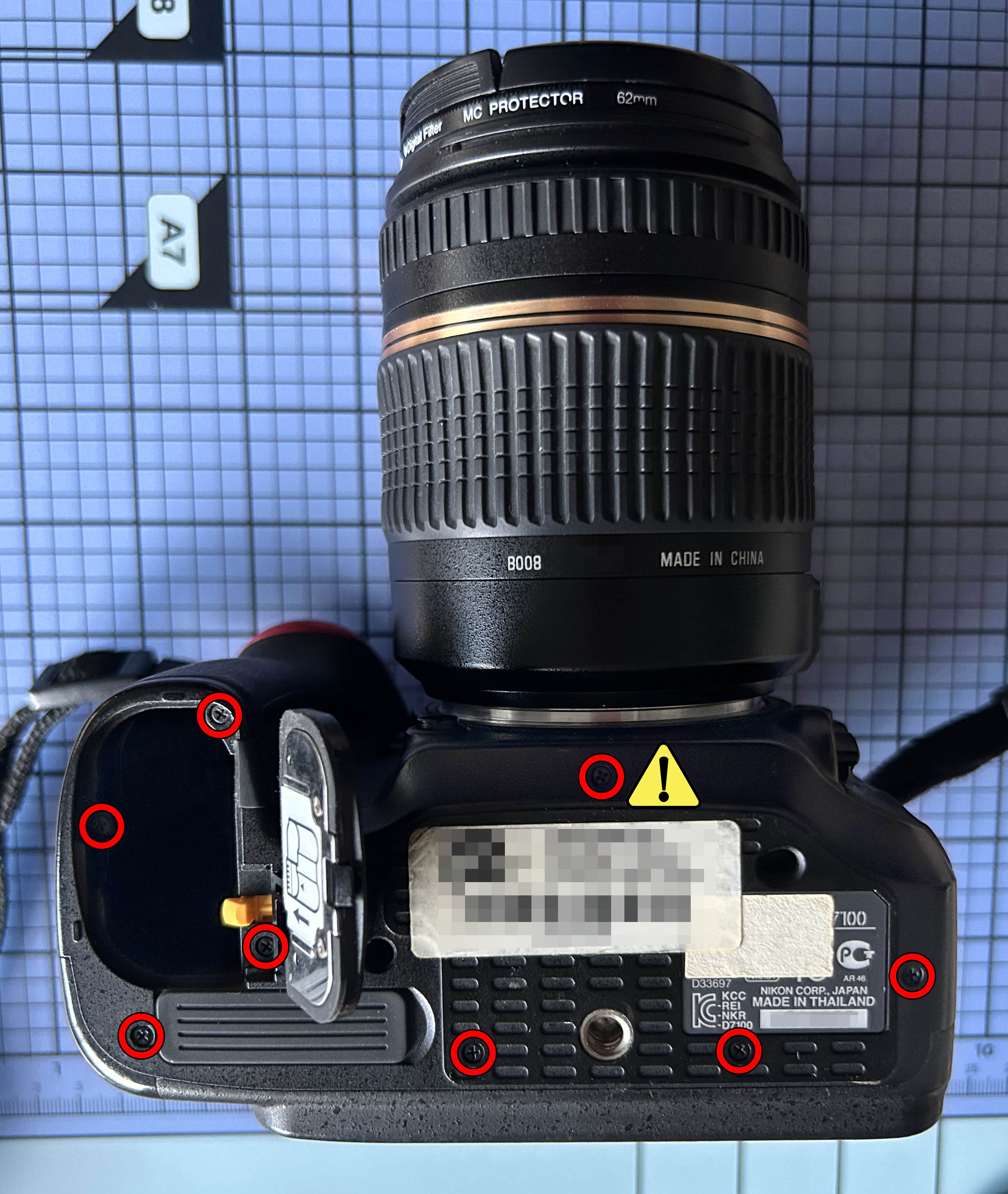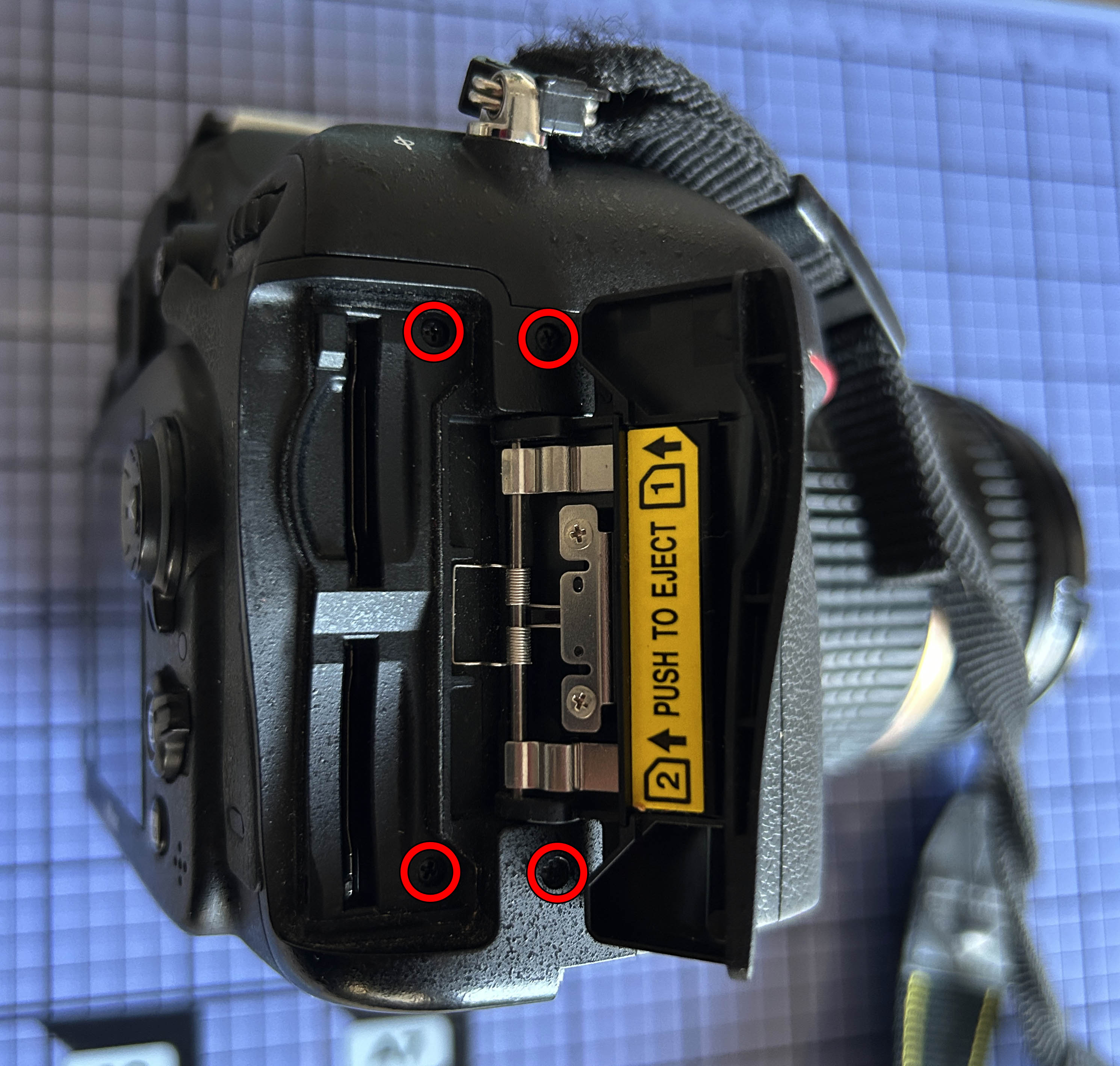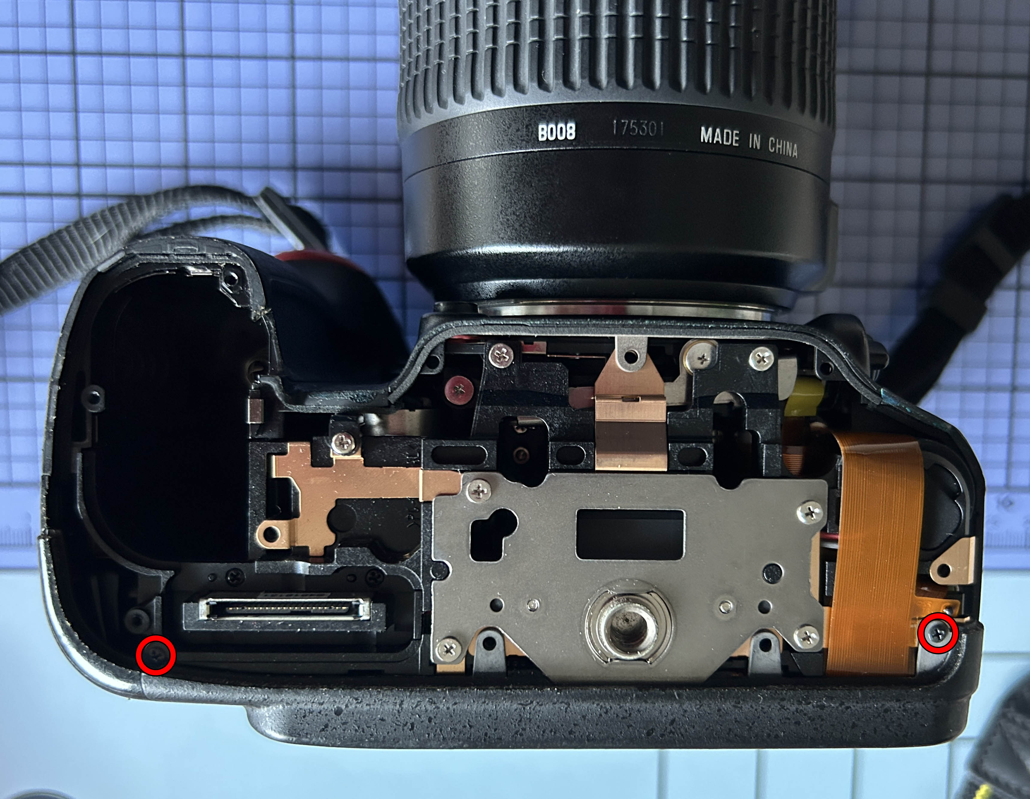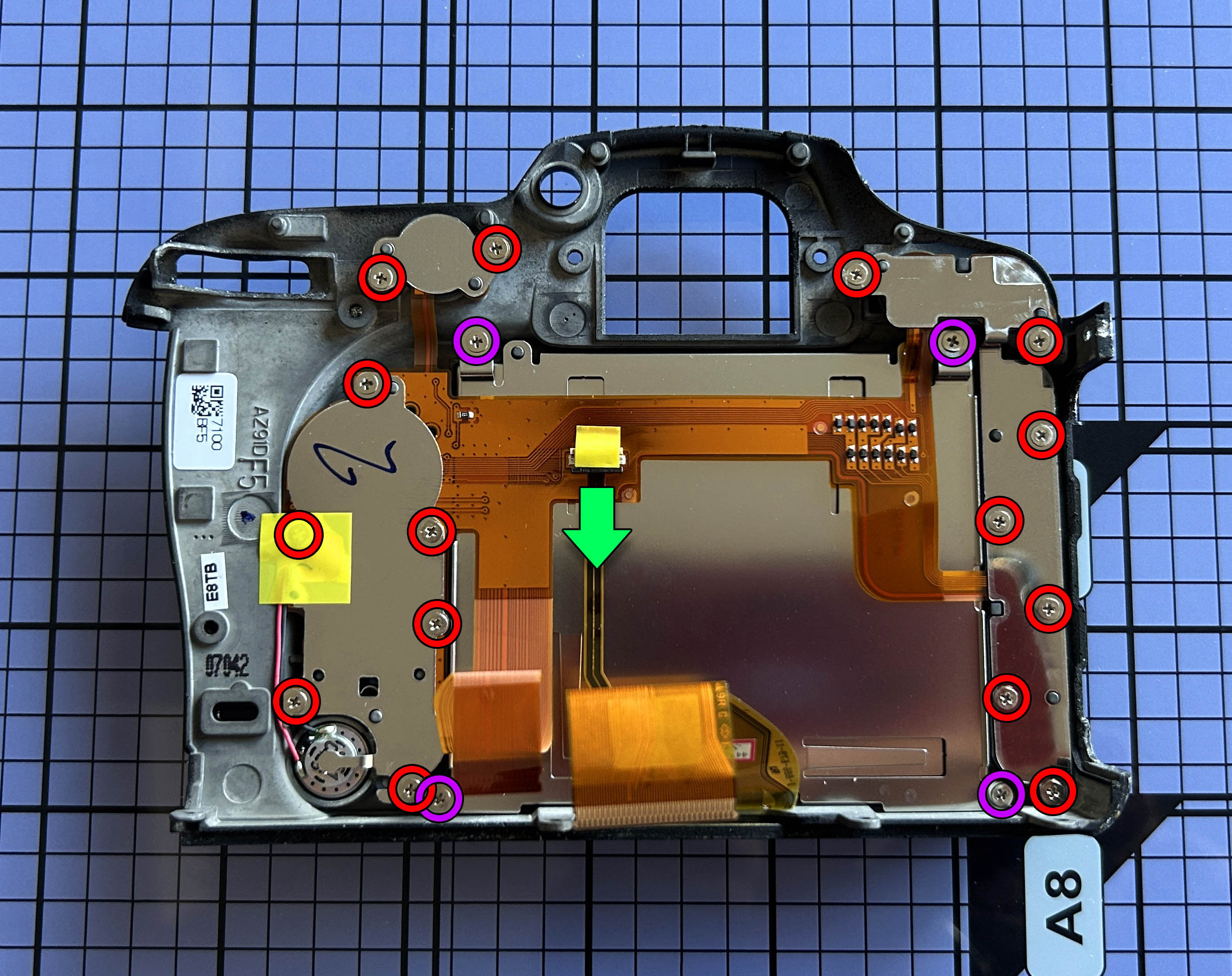 En estos casos en los que se presentan líneas verticales, máxime cuando no hay imagen, se puede sospechar de la pantalla LCD. Voy a abrir la cámara por si puedo tener más pistas de qué sucede. Extraigo la batería y la tarjeta SD y procedo a retirar el panel inferior, sacando los 8 tornillos marcados en la siguiente imagen. El tornillo cercano a la óptica es notablemente más largo que el resto, por lo que al montar se tiene que colocar en esta posición. El panel sale sin dificultad alguna.