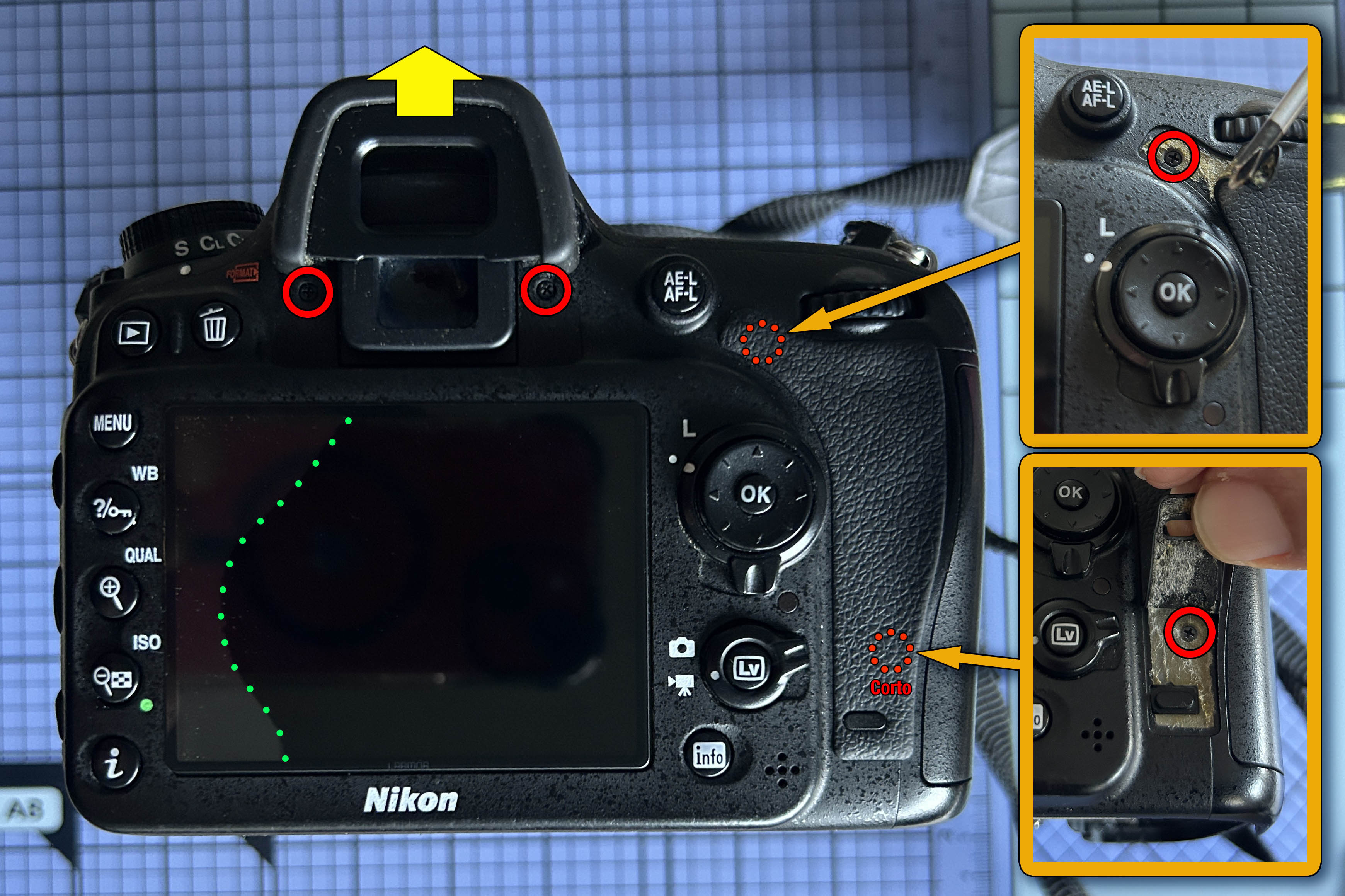 Seguidamente desmonto la goma del ocular como indica la flecha amarilla de la foto inferior, tras la cual hay 2 tornillos que hay que sacar. También hay 2 tornillos ocultos bajo el embellecedor de goma, los cuales retiro. Observo que la pantalla tiene una zona de diferente color, que me hace sospechar que ha tenido algún golpe. La he marcado con una línea de puntos verde.