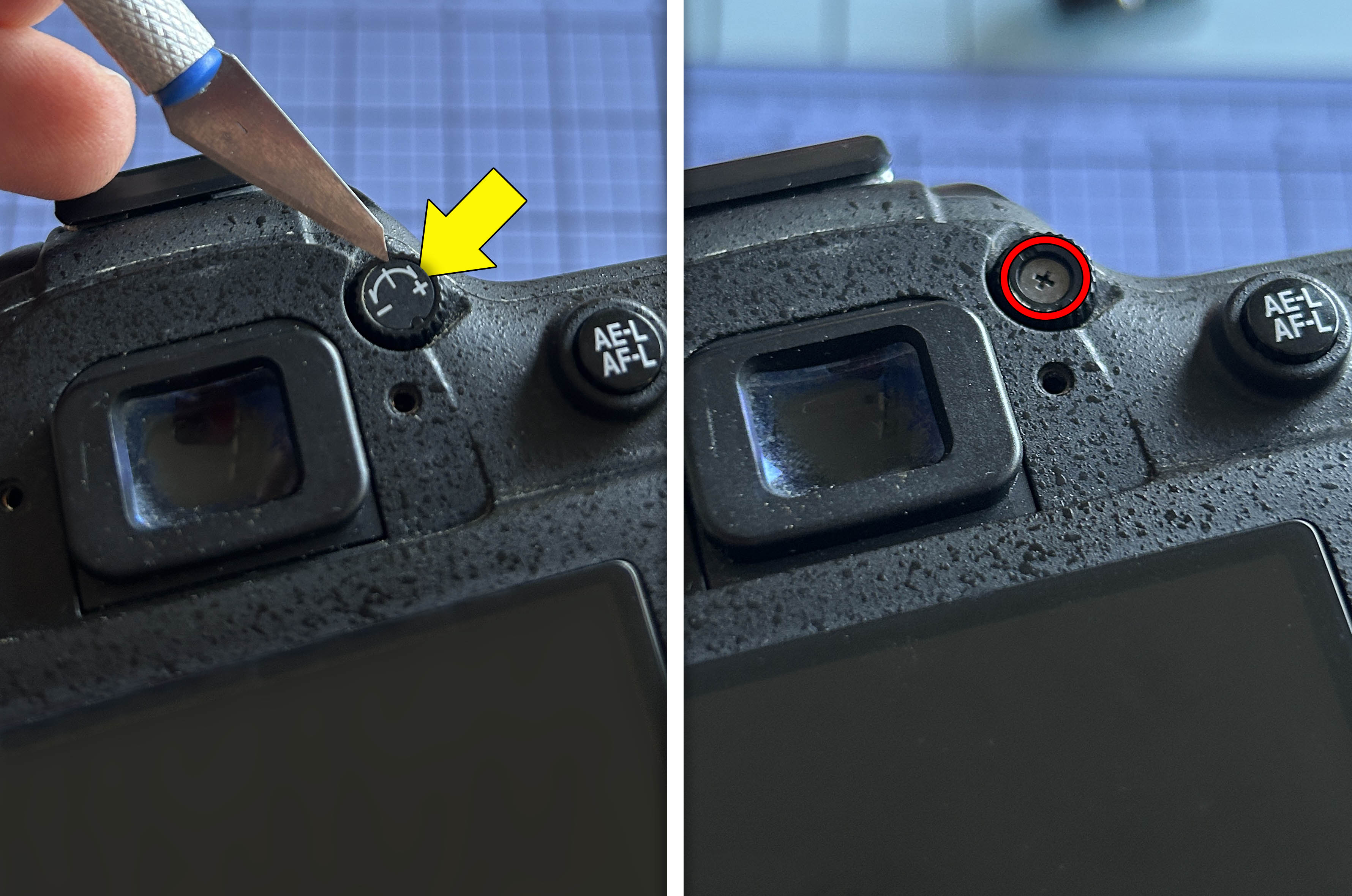 También tengo que quitar el tornillo oculto que hay tras el regulador de dioptrías del ocular. Con un bisturí despego la etiqueta, con lo que tendré acceso a dicho tornillo. Retiro el mando giratorio correspondiente.
