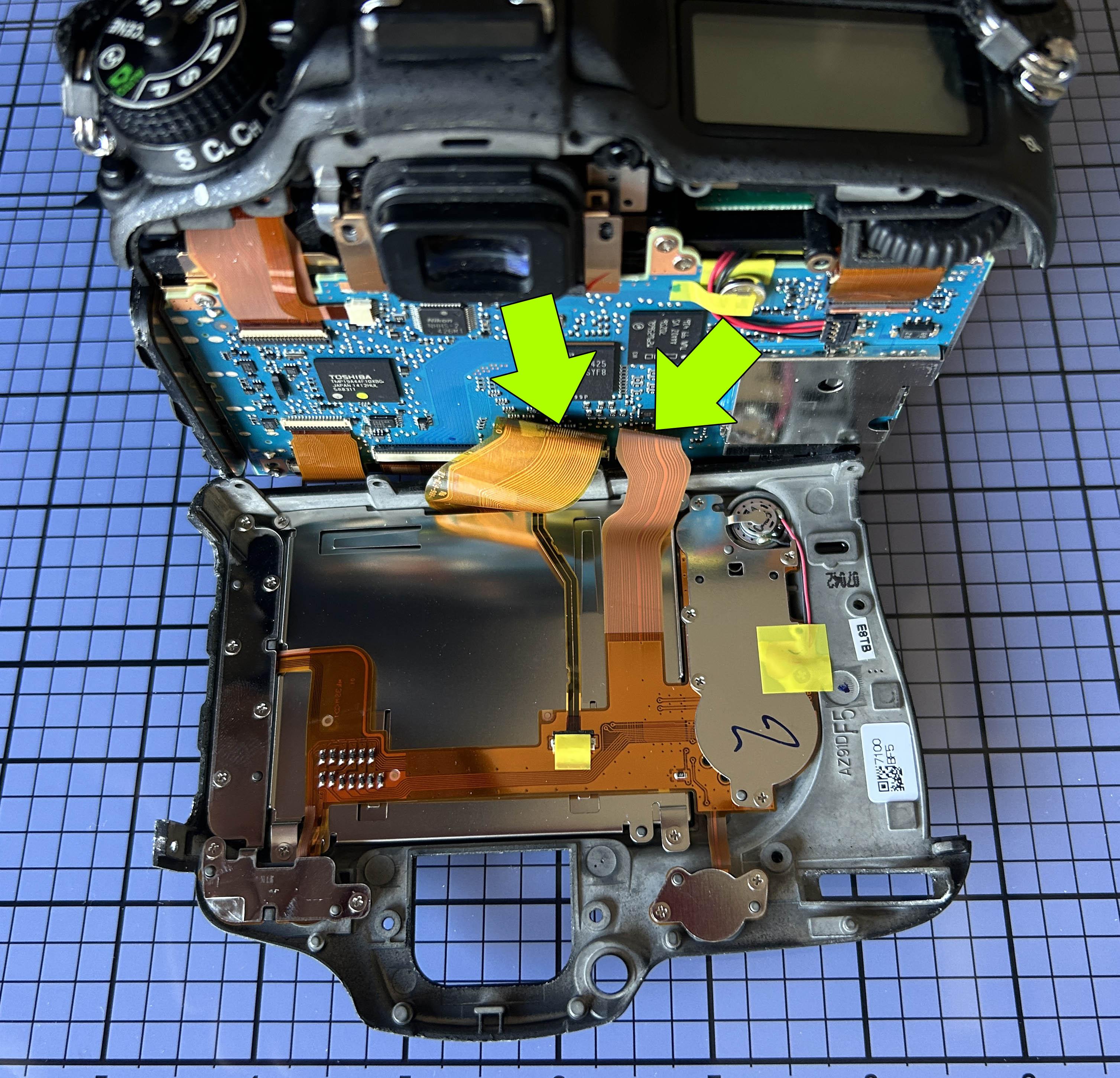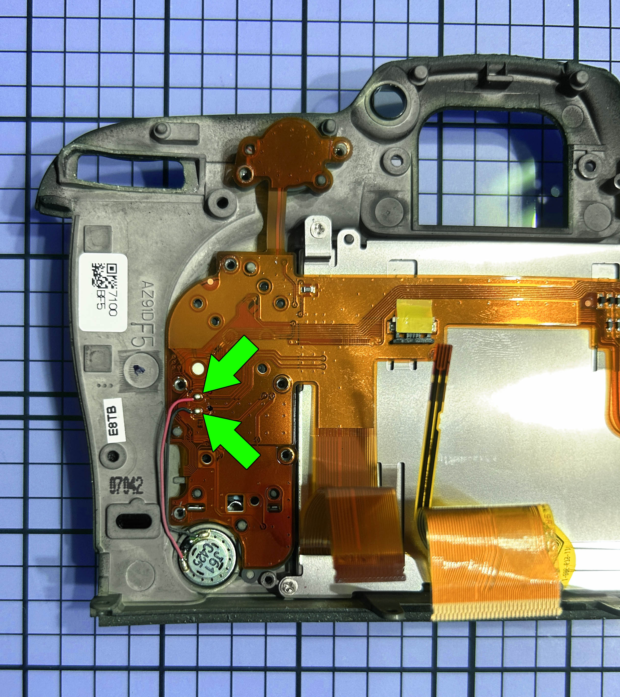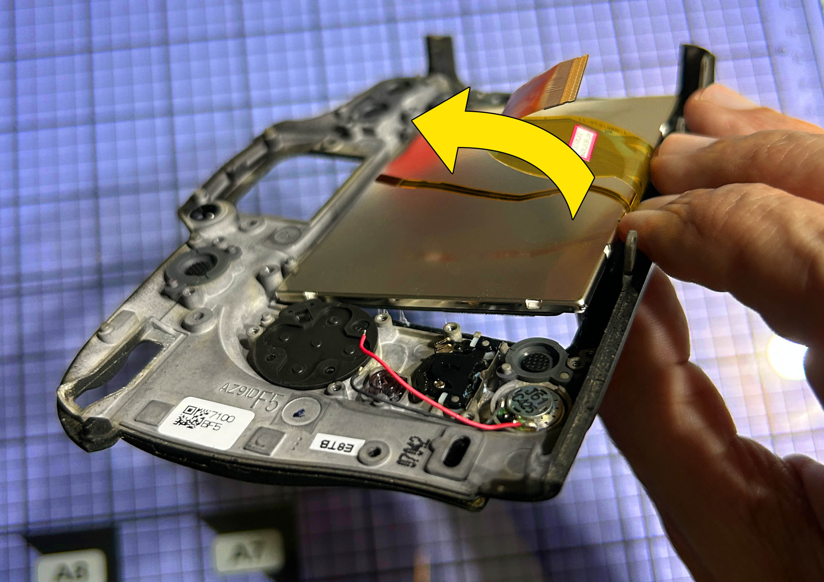 Abato cuidadosamente el panel posterior. Hay dos cables planos que tengo que desconectar de la placa principal. Llevan conectores slim con una barra negra que hay que abatir 90 grados, lo cual los libera. Uso para este procedimiento una fina herramienta de plástico con forma de espátula pequeña y los abro con sumo cuidado, ya que son conectores muy delicados.