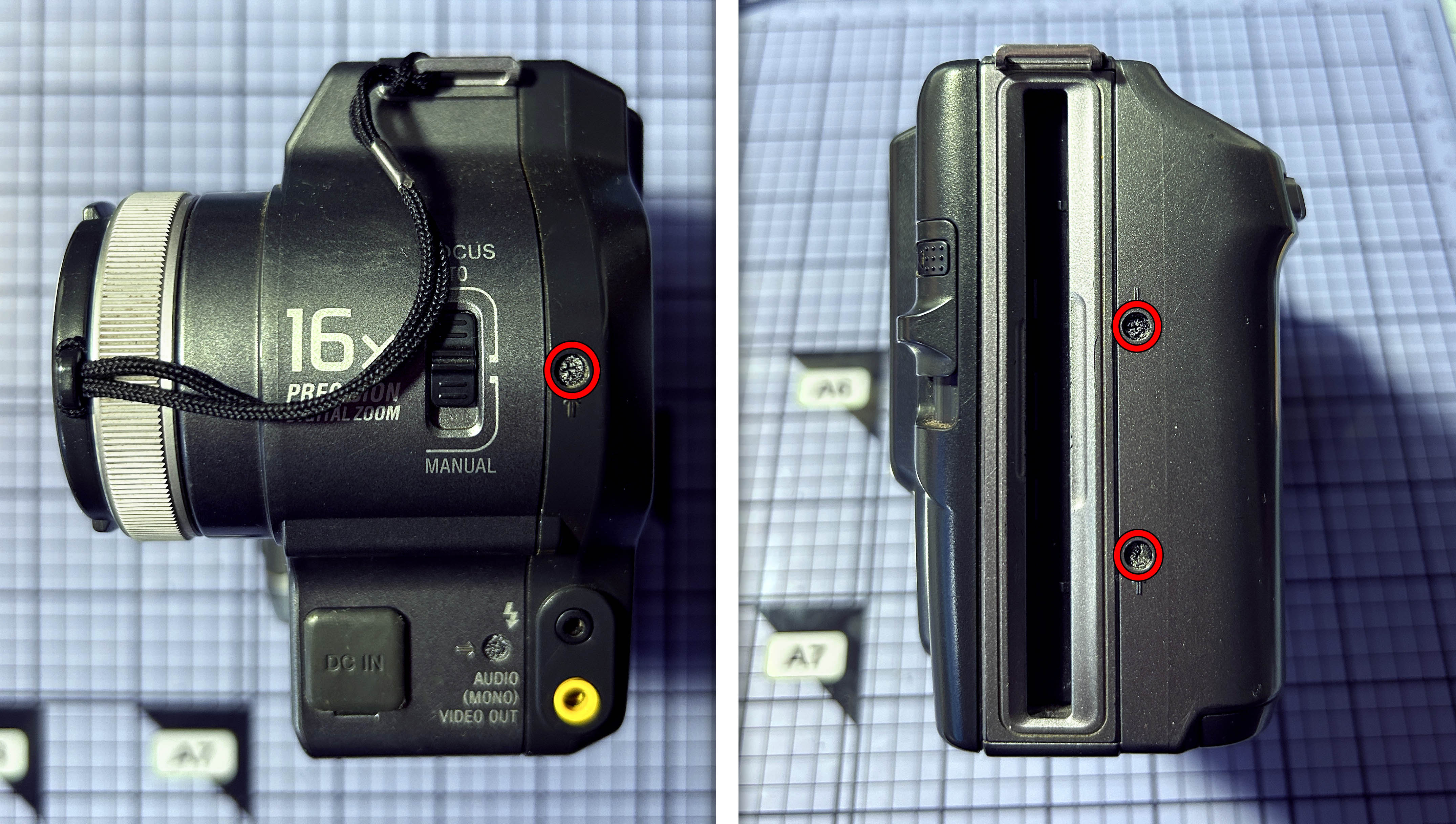 En los laterales de la cámara hay 3 tornillos que tengo que retirar, 1 en el lado de la óptica y 2 en el lado del floppy.
