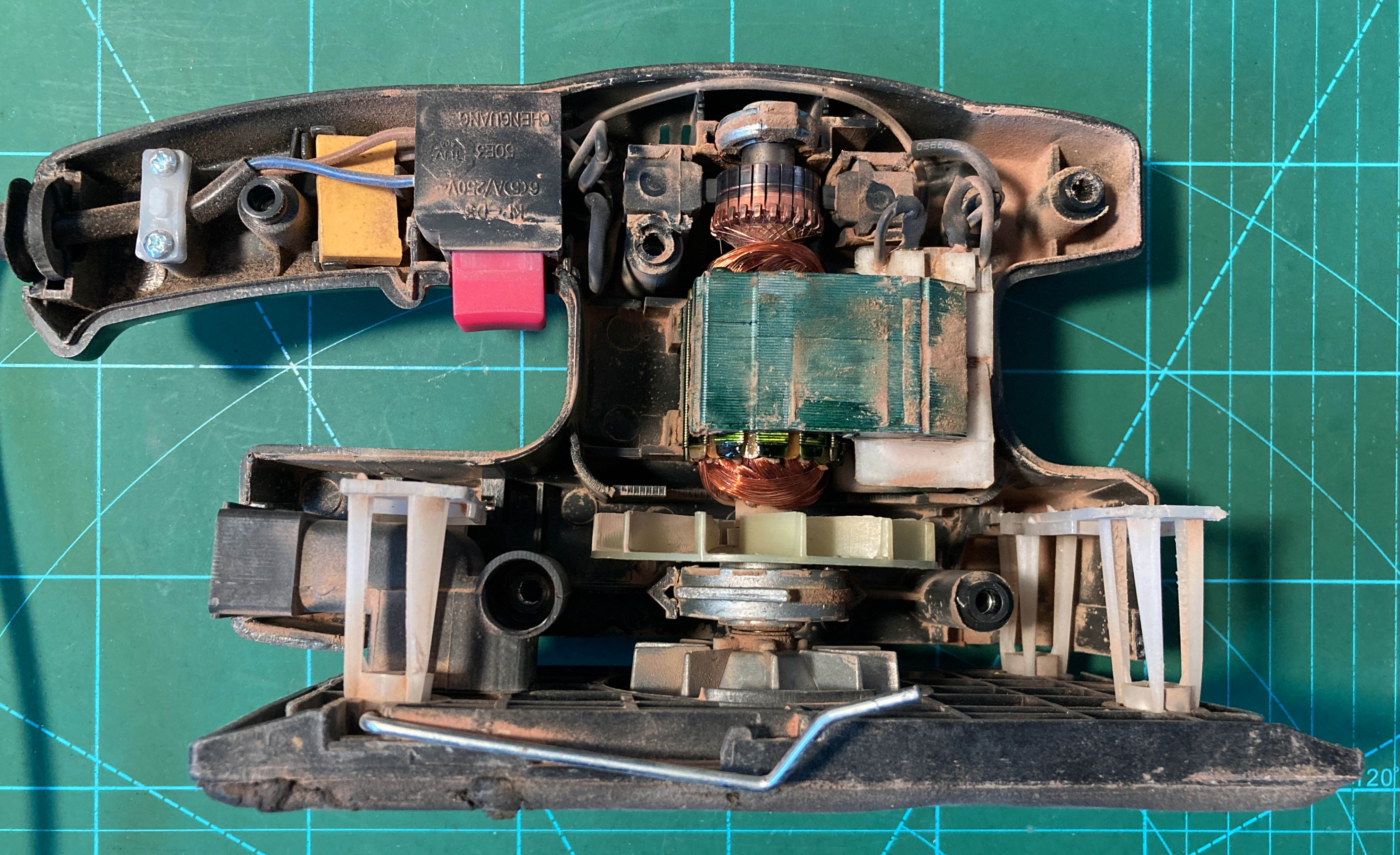 Una vez abierta la batidora puedo ver el interior, con el bloque motor, el selector de velocidad, etc. En principio voy a revisar las escobillas del motor, ya que es el elemento que más estrés mecánico y eléctrico sufre. Para sacarlas (hay una en cada lado del estátor del motor) tengo que liberar sendos resortes. Las escobillas caerán por gravedad al no tener el empuje de dichos resortes.