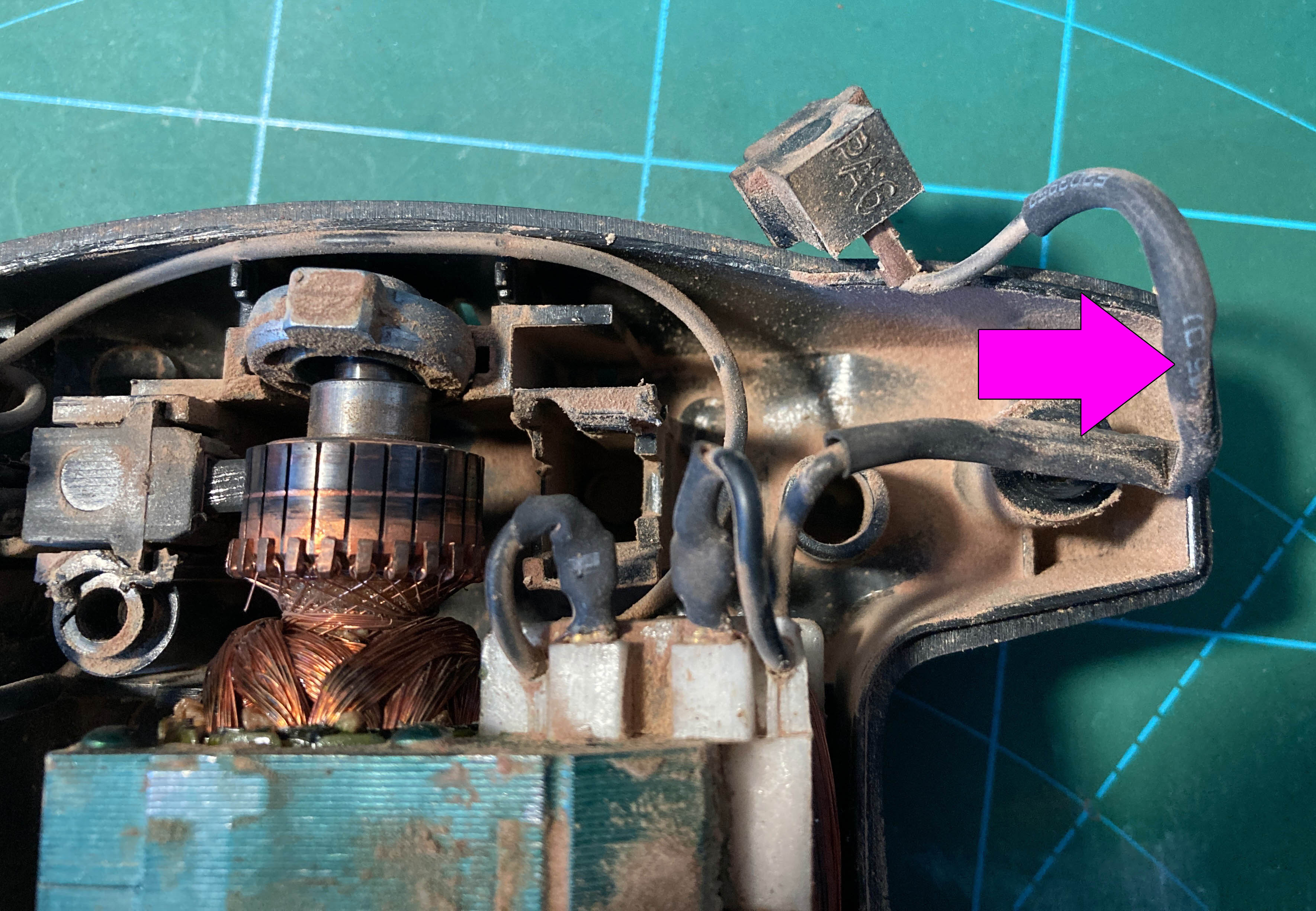 Lo que haré será anular el interruptor. Si bien la batidora no dispondrá del modo “Turbo”, sí que funcionará en sus diferentes velocidades con normalidad. He desconectado el interruptor, que tiene un diodo 1N5408, un rectificador de 3 amperios. Puenteo los cables directamente a través del diodo. Le añado una protección basada en termorretráctil y protector térmico.