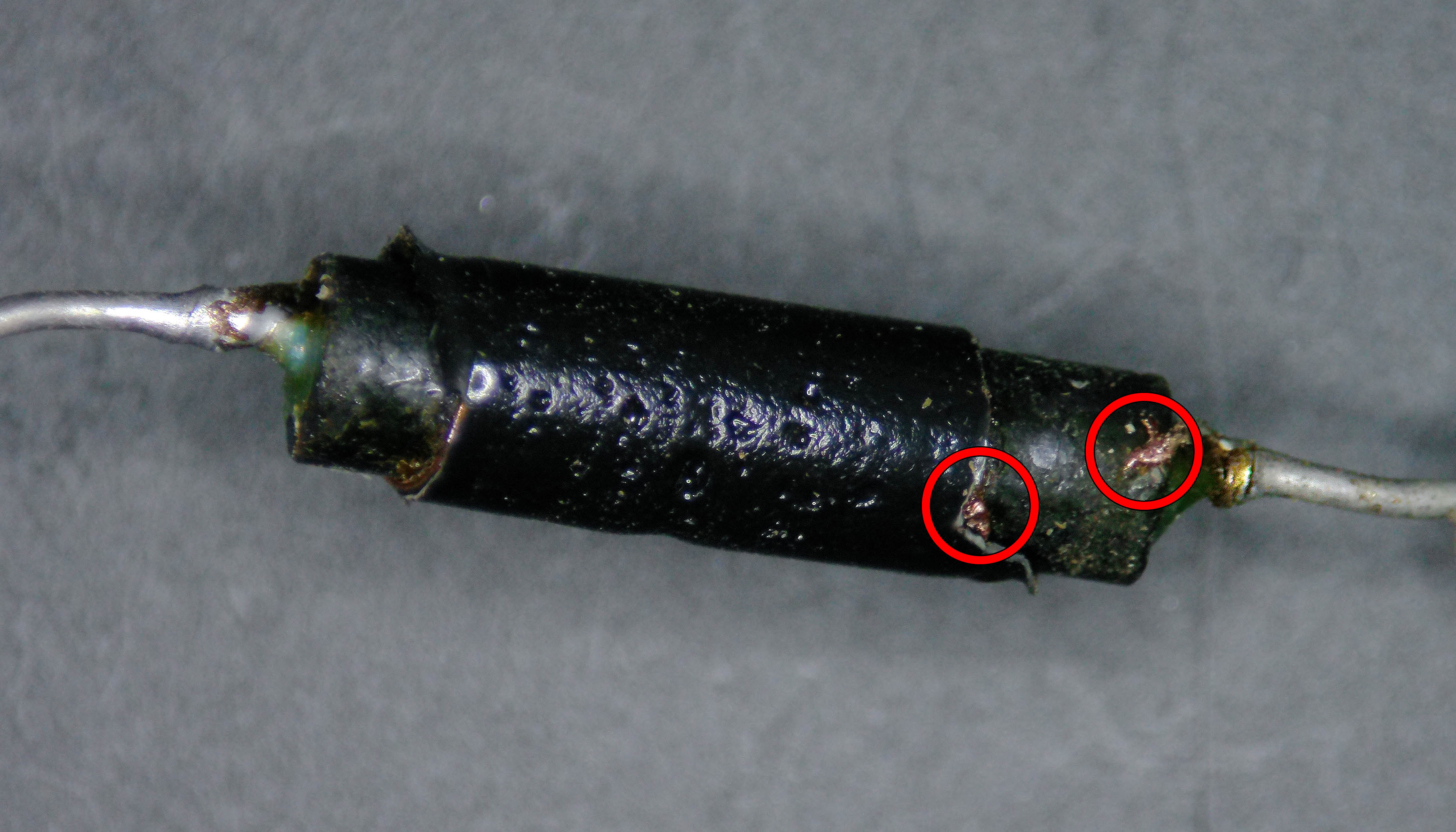 Con el microscopio puedo ver que incluso el mando de plástico está quemado por la parte interior, y los contactos han quemado también la base de baquelita que, con total seguridad, es la que desprende ese olor tan fuerte.