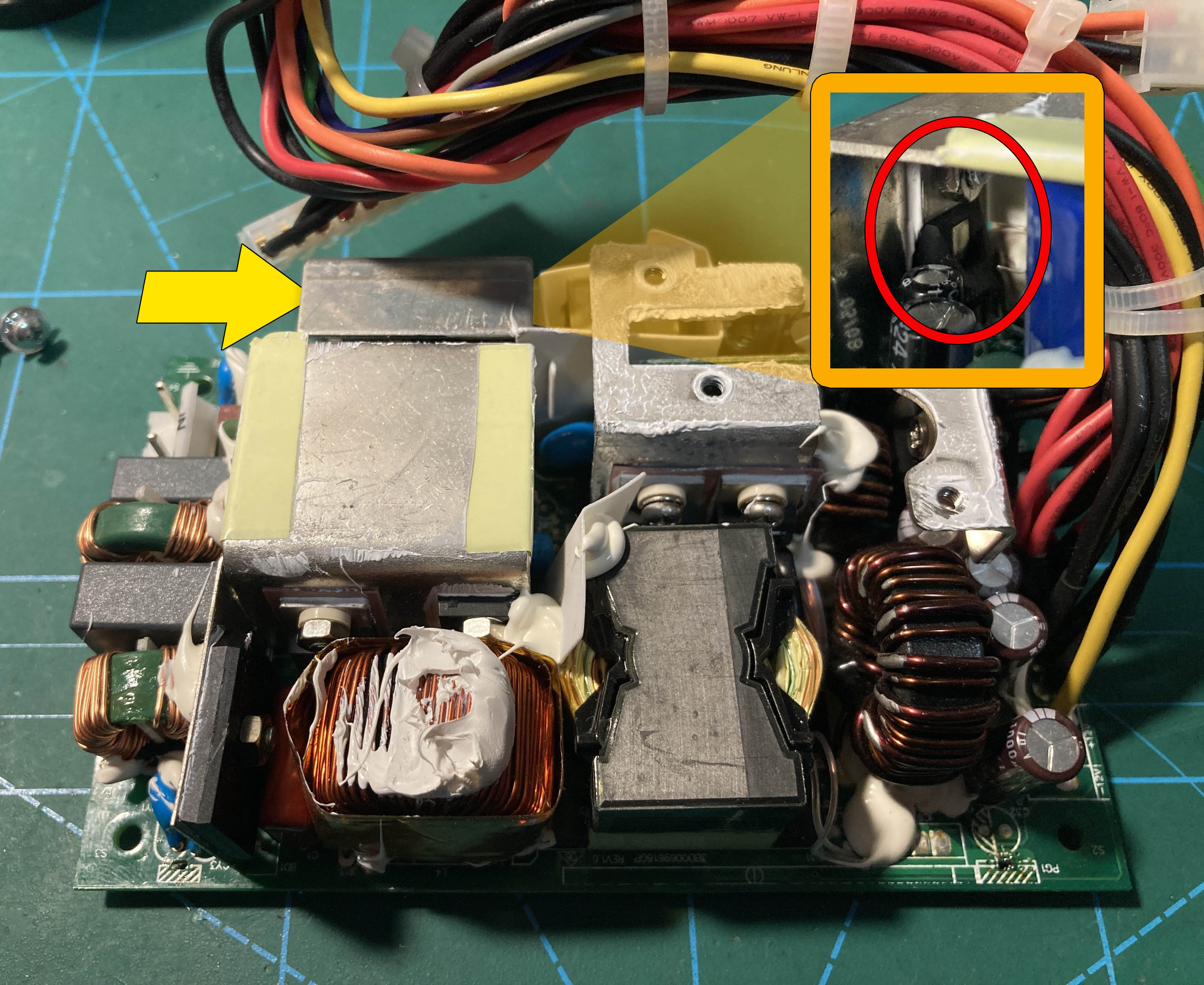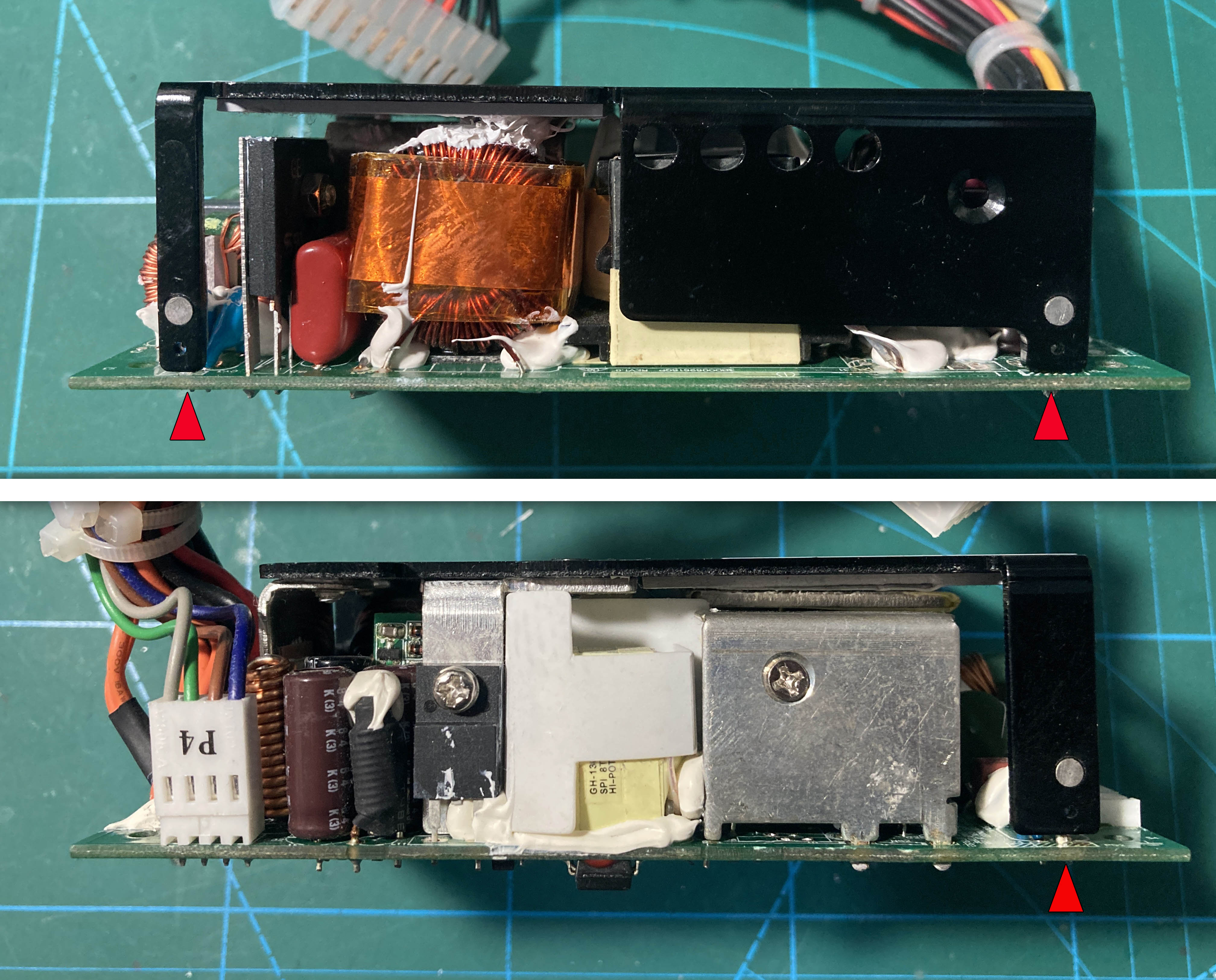 Observando la fuente veo una pátina sospechosa en la cara superior, cerca de los condensadores (siguiente foto, parte derecha). Muy probablemente se trata del líquido interior de los condensadores. Tocará cambiarlos.