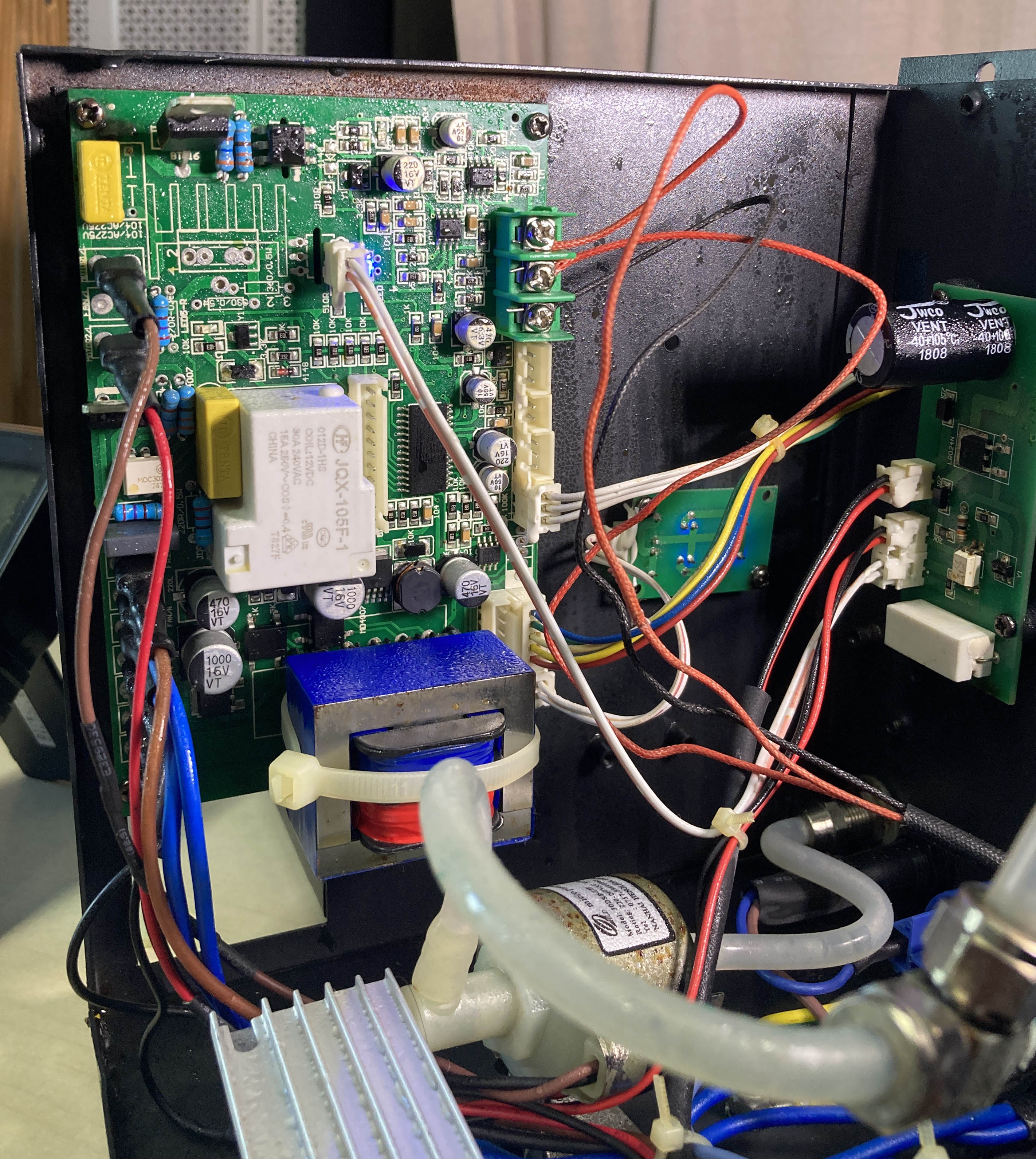 Enseguida descubro el problema: hay una pista cortada en la placa de control, que después veremos bajo el microscopio. Desmonto la placa afectada y le doy una buena limpieza. Dado el estado no escatimo en medios: bajo el grifo mojo la placa y con un pincel distribuyo jabón para eliminar los restos aceitosos. Después de enjuagar uso una pistola de aire de alta presión para expulsar toda el agua existente. También se limpia el resto de elementos.