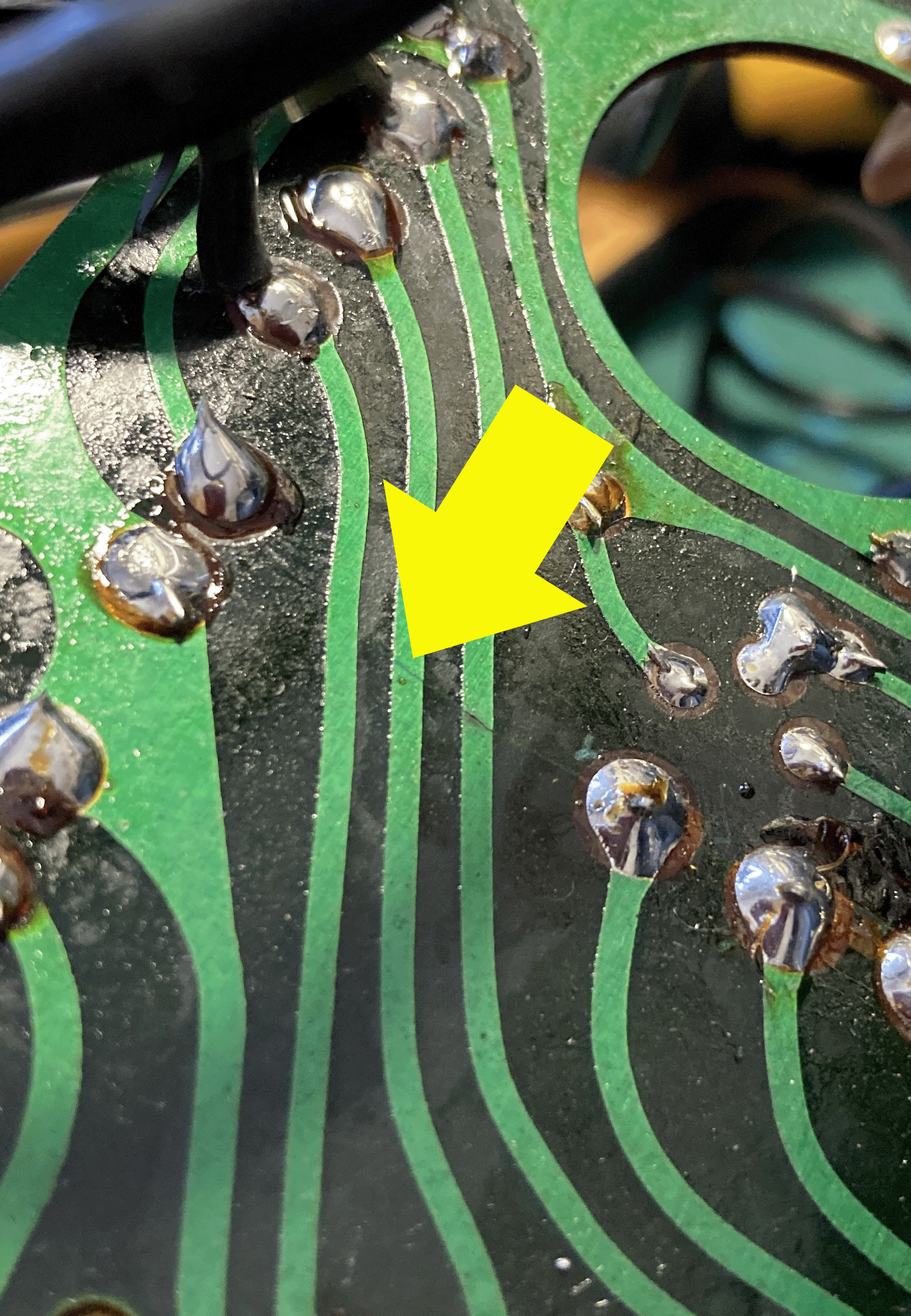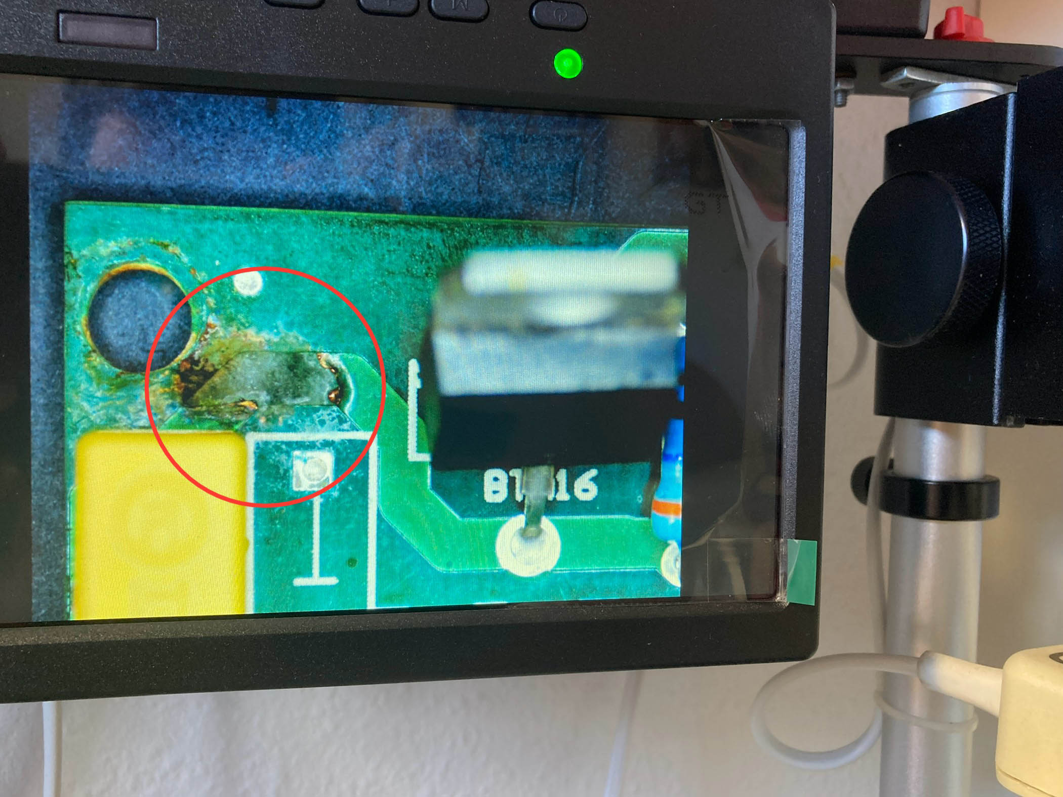En el microscopio observo la «tragedia»: una pista se ha vaporizado haciendo de fusible por culpa de un cortocircuito. Al estar junto a un triac sospecho inmediatamente de su integridad.