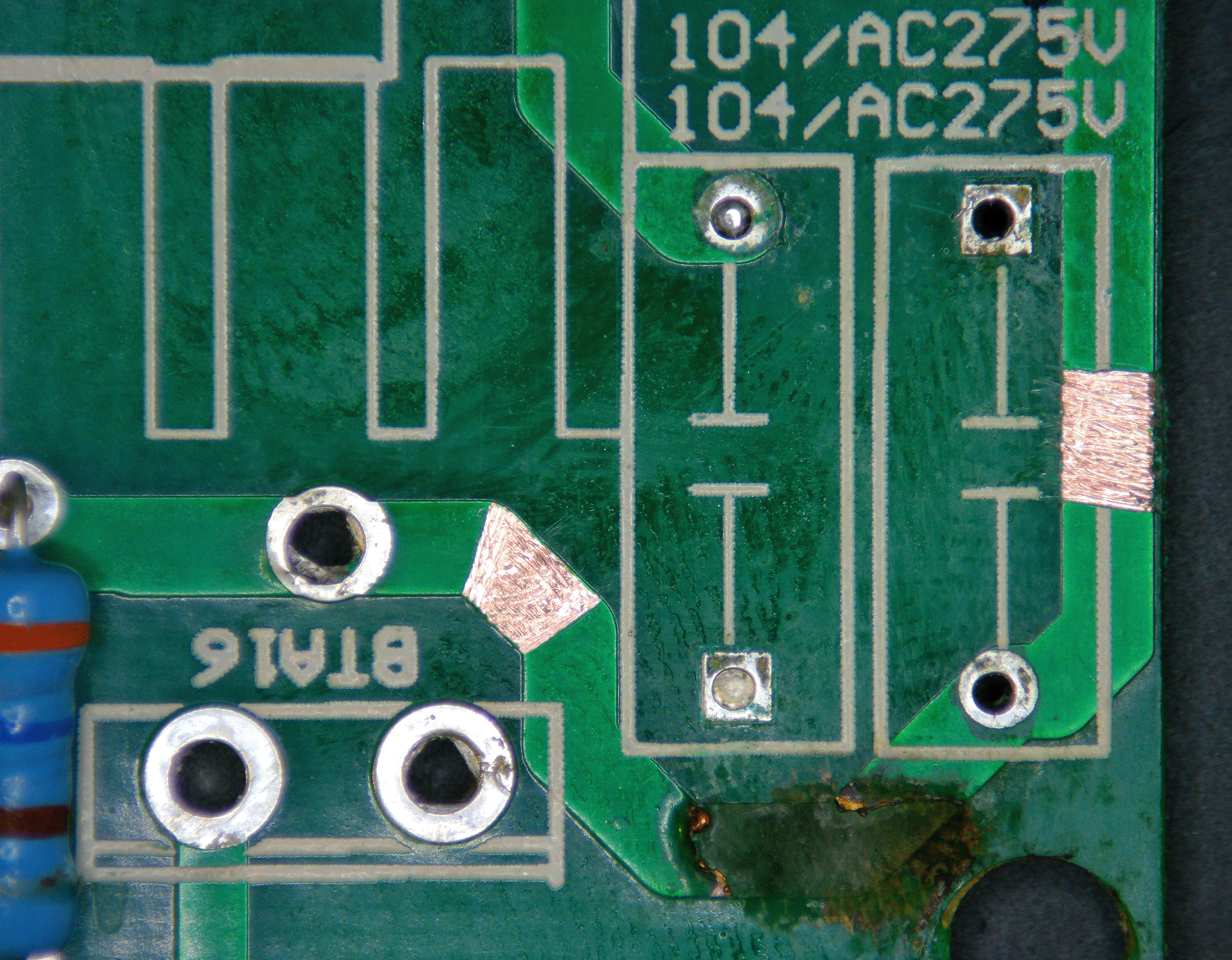 Finalmente substituyo el triac, un BTA16-600B, y le añado un disipador que he modificado para que las aletas inferiores no toquen los componentes adyacentes.