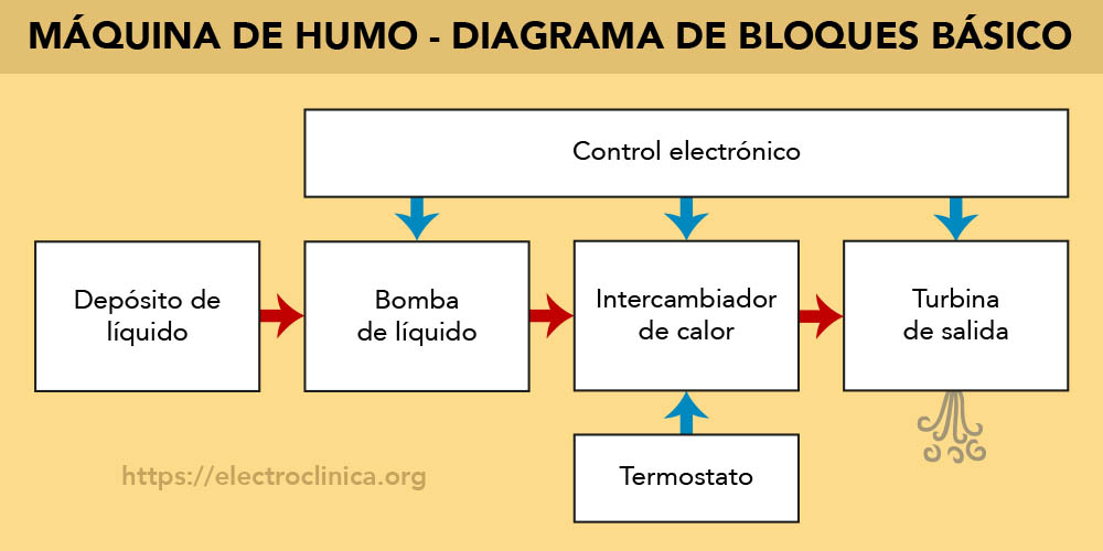 El funcionamiento no es muy complicado y puede resumirse en el siguiente diagrama de bloques. Como puede verse, el líquido especial es aspirado y bombeado al intercambiador de calor, que es similar a una caldera. Allí se calienta y se genera el vapor, muy rico en humo, que es expulsado al exterior con la asistencia de una turbina.