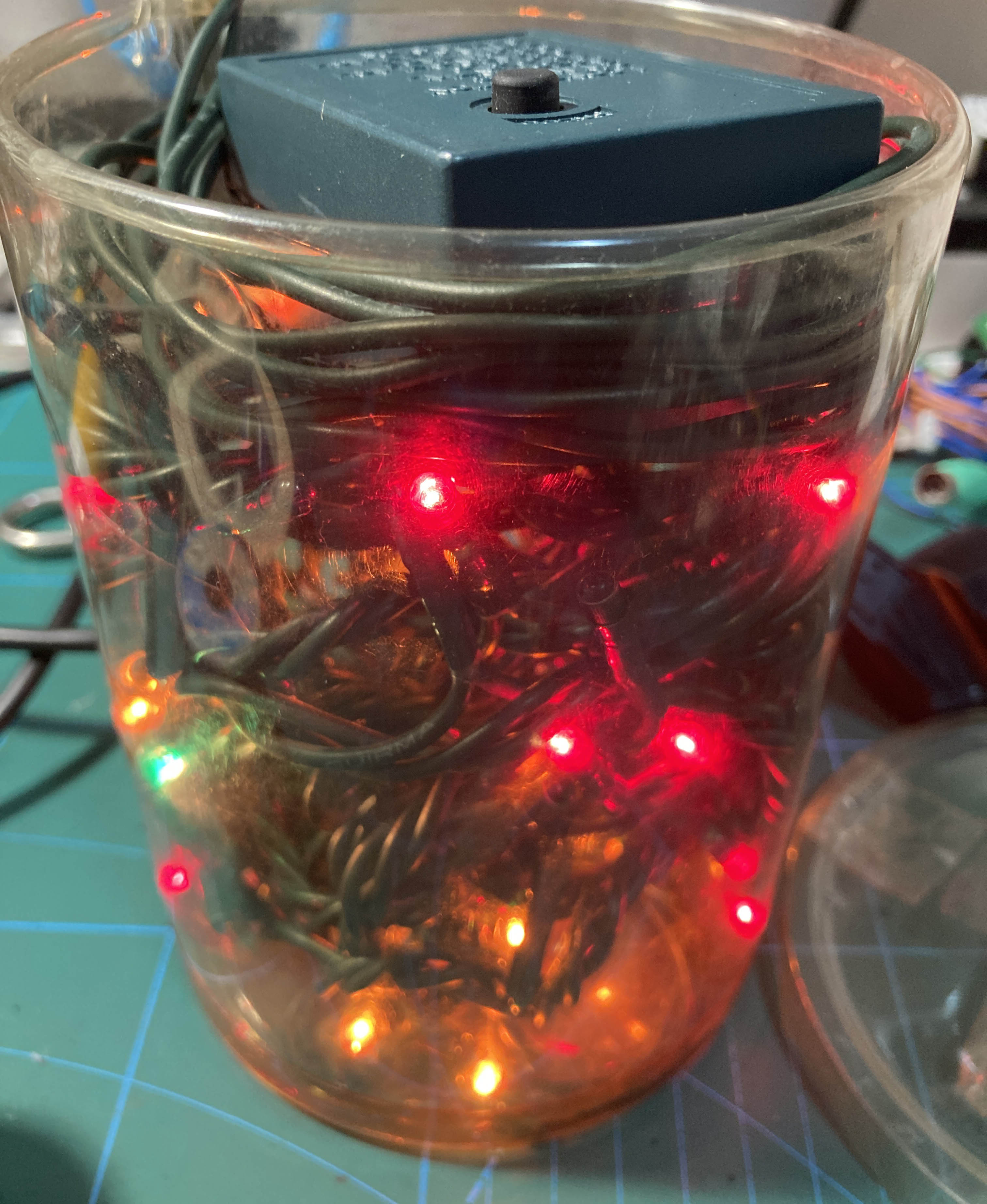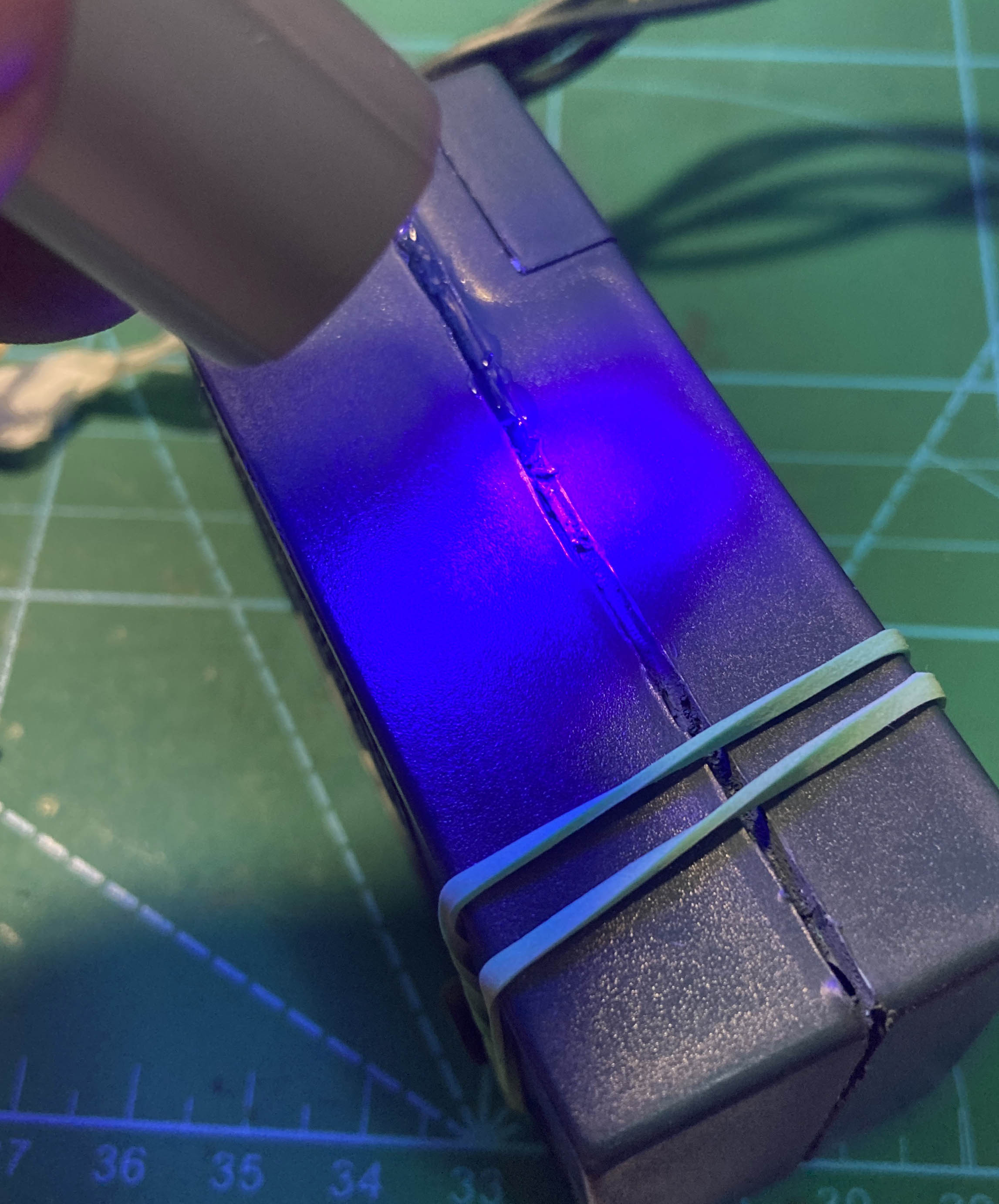Monto todos los elementos en la caja. La placa queda soldada a los pines del potenciómetro, por lo que no hace falta atornillarla a la caja. He usado dos tramos de tiras de led adhesivas, que he pegado sobre la tapa de la caja. En total serán 6 leds. He acoplado un portapilas de 9V en un lateral para poder instalar una pila que alimentará el sistema. Dicho portapilas está atornillado y asegurado con resina de secado instantáneo por luz ultravioleta.