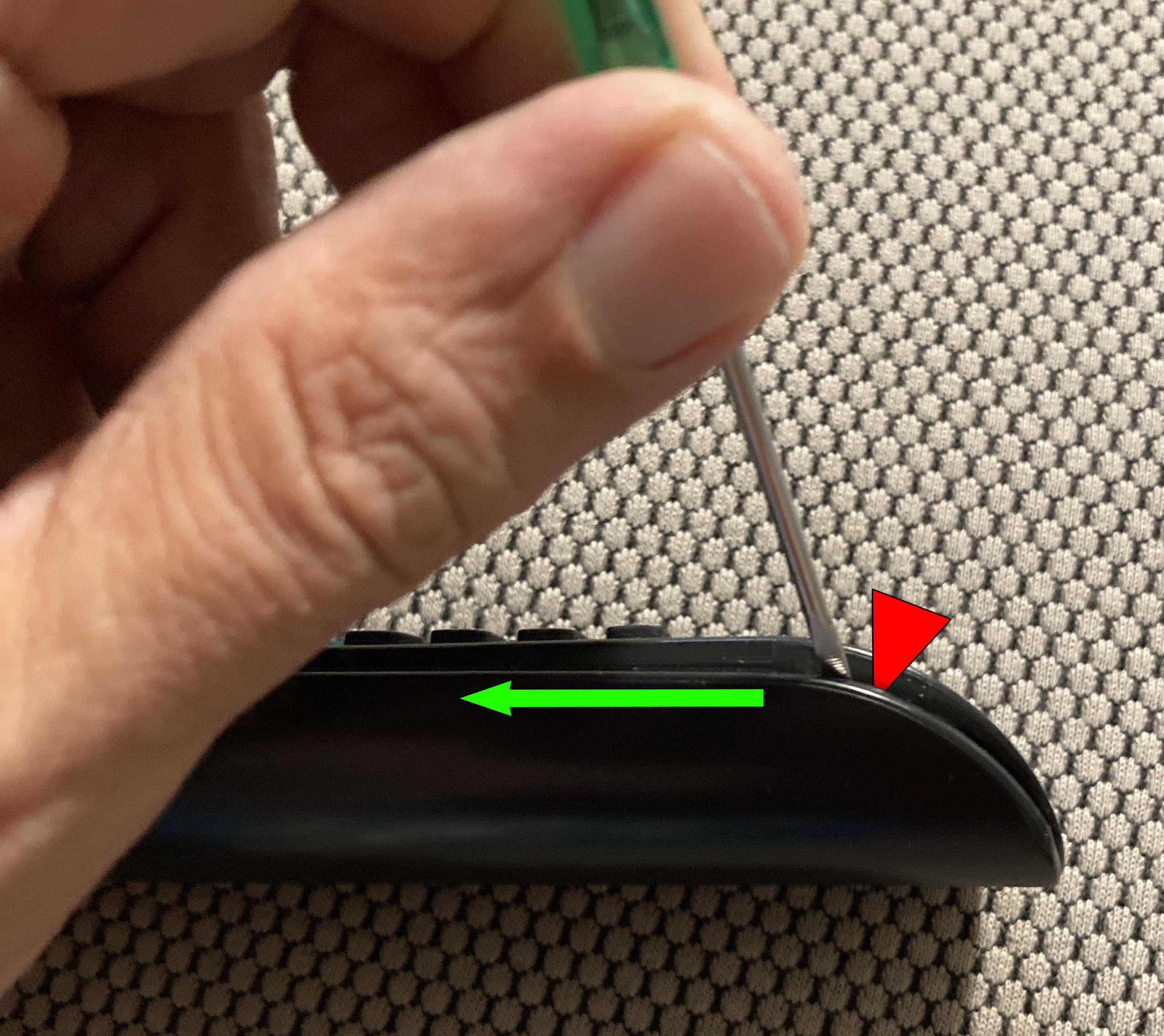 La solución pasa por realizar una limpieza a fondo del interior. Para abrir este mando en concreto hago palanca en un lateral con un destornillador plano muy pequeño y voy repitiendo la operación a lo largo del contorno. Voy escuchando “clacks” que corresponden a las pestañas de plástico que se van separando.