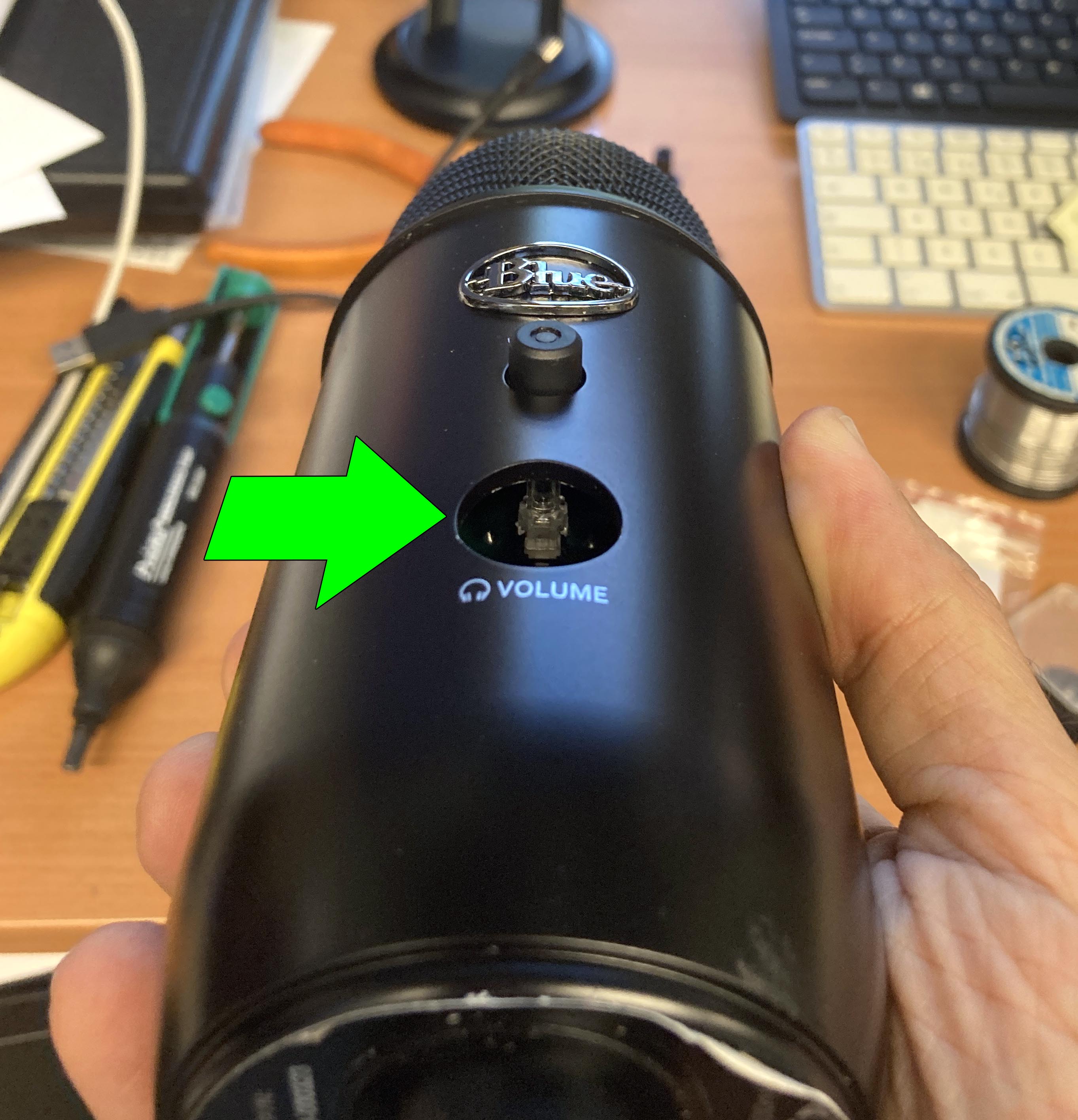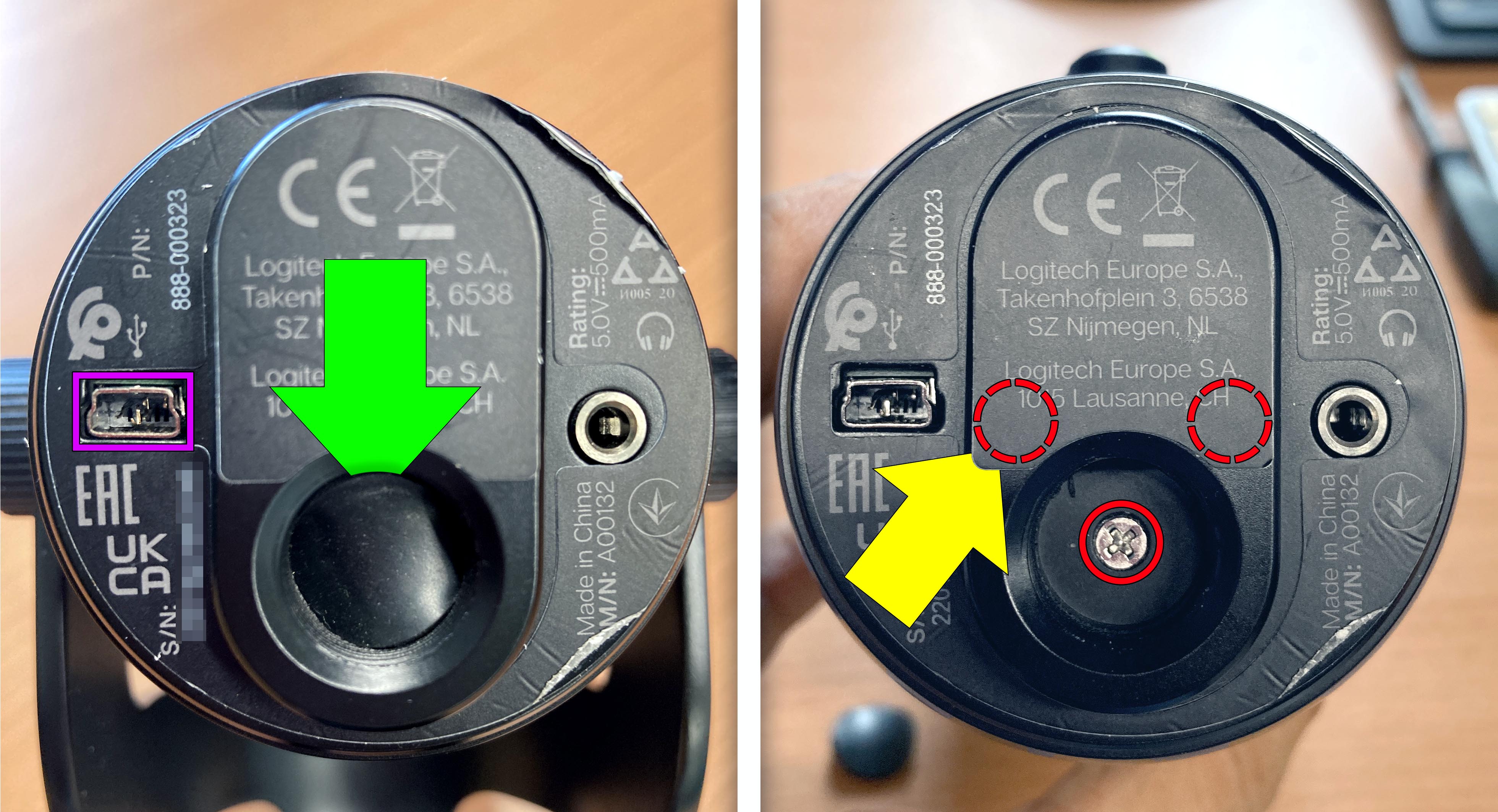 La única solución es cambiar el conector USB. Tengo que abrir el micrófono para acceder al mismo. La siguiente imagen muestra la ubicación de los 3 tornillos a extraer: uno bajo la goma de protección de la rosca y otros dos bajo la etiqueta indicada con la flecha amarilla. El cuadrado magenta muestra en conector partido.