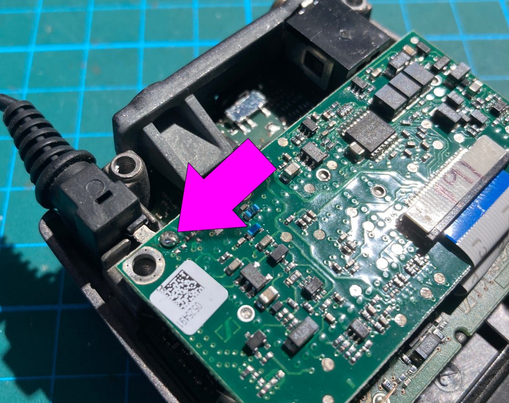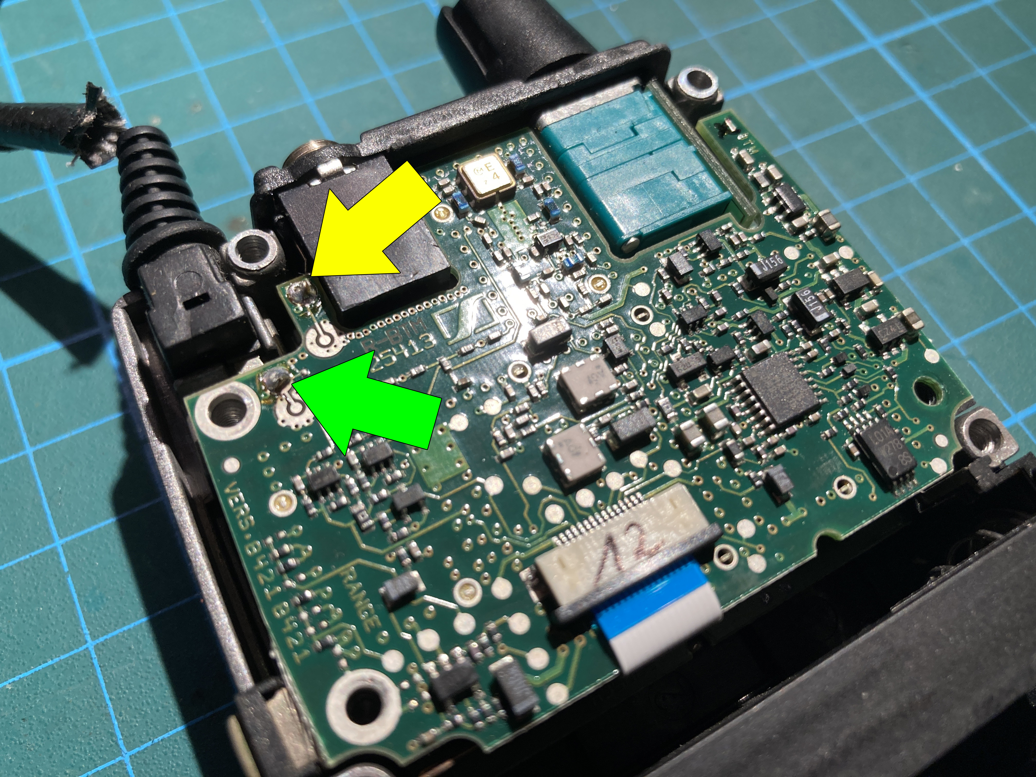 La solución ideal sería comprar los condensadores variables e instalarlos. De todas formas intentaré una solución alternativa que no suponga un gasto extra: alinear manualmente las láminas. Tengo que desmontar el condensador variable C8, desoldando los puntos marcados con flechas rojas en la siguiente imagen.