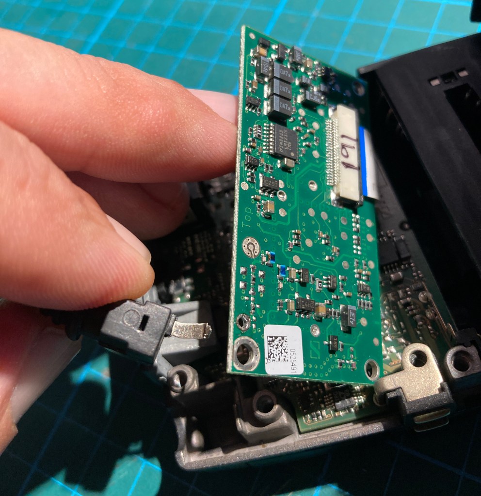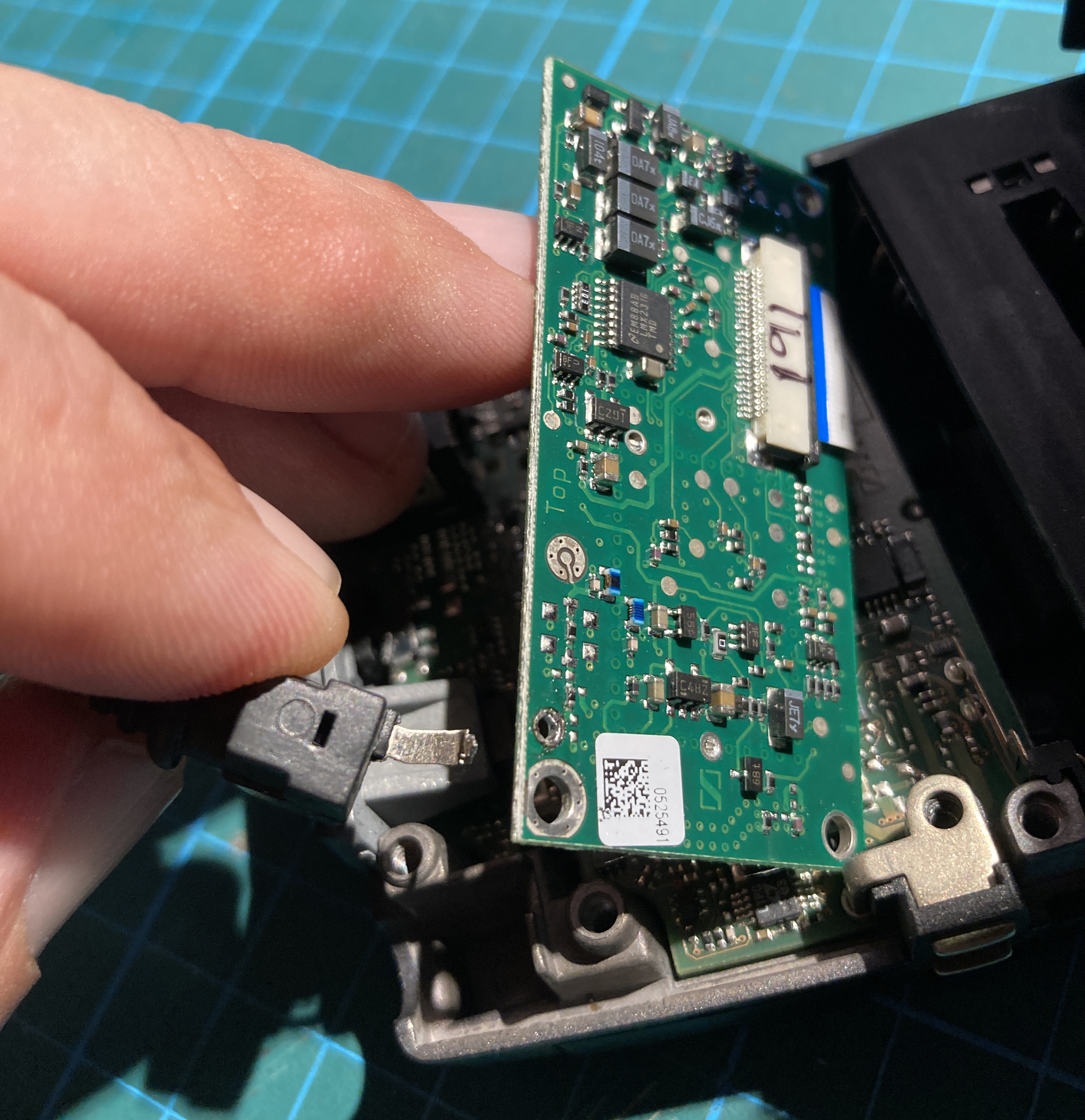 Al abrir queda patente el problema. Efectivamente se trata del condensador variable C8 de la etapa de antena, cuyas láminas están desalineadas y se frotan entre sí. A esto hay que sumar una leve holgura en el eje que acentúa aún más el problema. Además, el condensador variable C7, de la etapa del transmisor, también tiene algún problema similar.